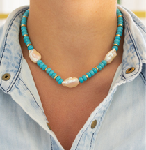 Pictured above is our best selling Tiny Beaded Rectangle Necklace, Turquoise and Pearl Necklace, and our What Dreams are Made of necklace.