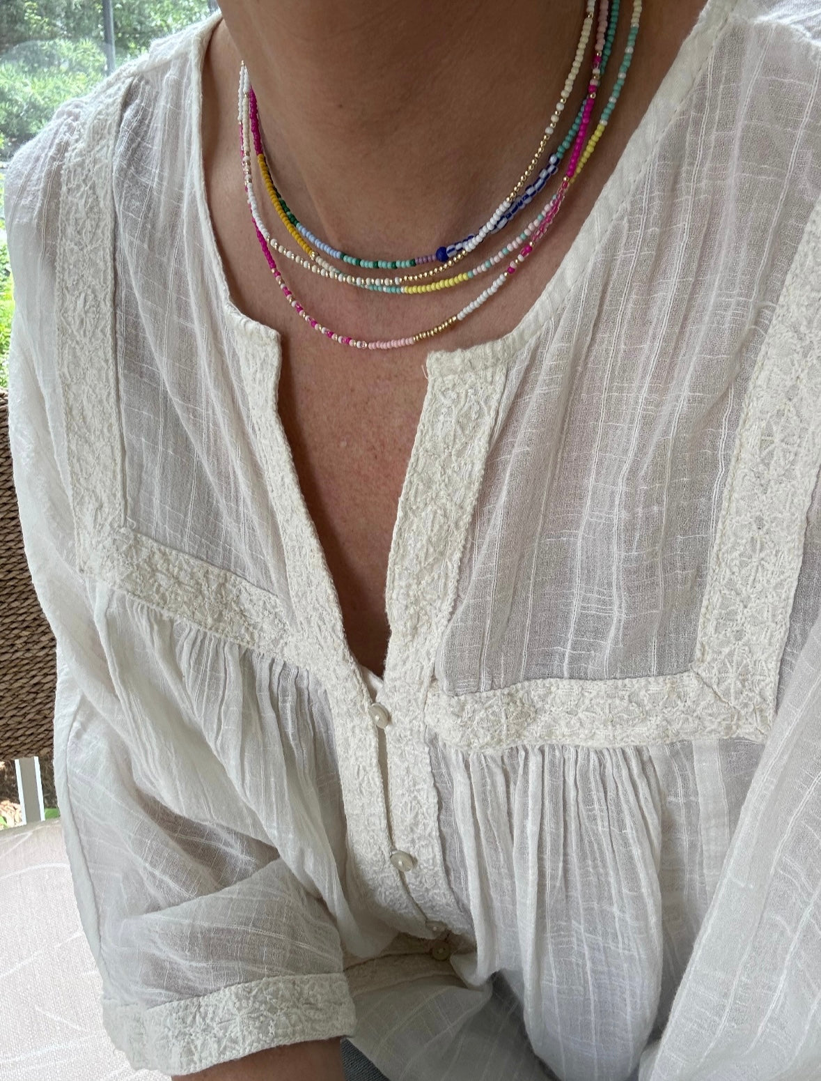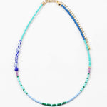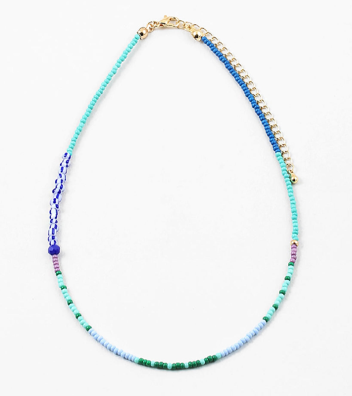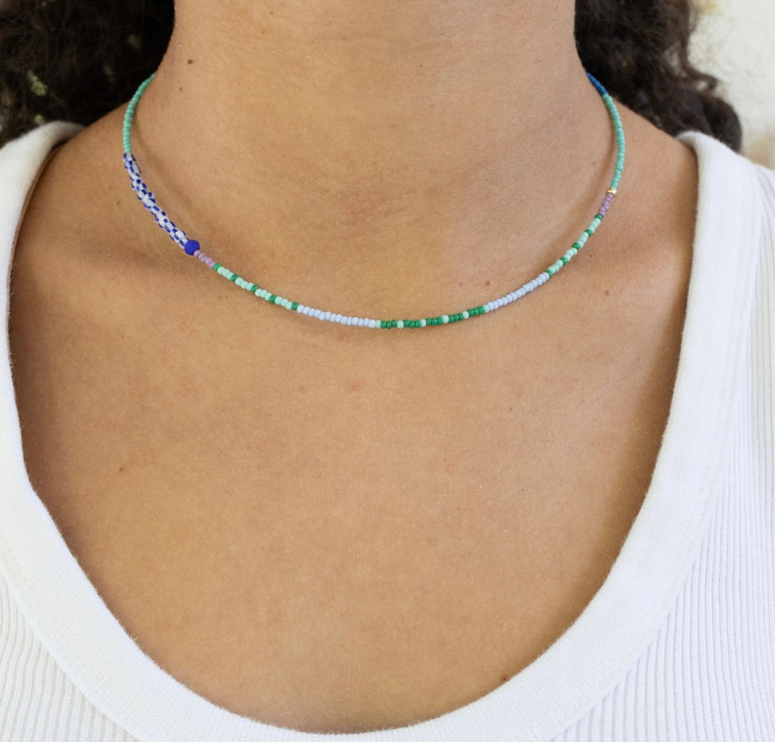 A delicate mix of hand-strung seed beads in soft turquoise, ocean blue, lavender, and fresh green hues creates an easy, sun-washed statement. Thoughtfully accented with subtle pops of pattern and finished with a gold clasp and extender for an adjustable fit. Lightweight and effortless, this necklace is perfect worn alone for a hint of color or layered with your everyday favorites.