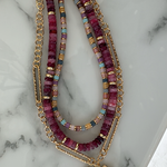 A three layered necklace set including necklaces with a gold chain and heart pendant, multicolored resin stone necklace, as well as a necklace with shades of rose and cranberry colored beads.