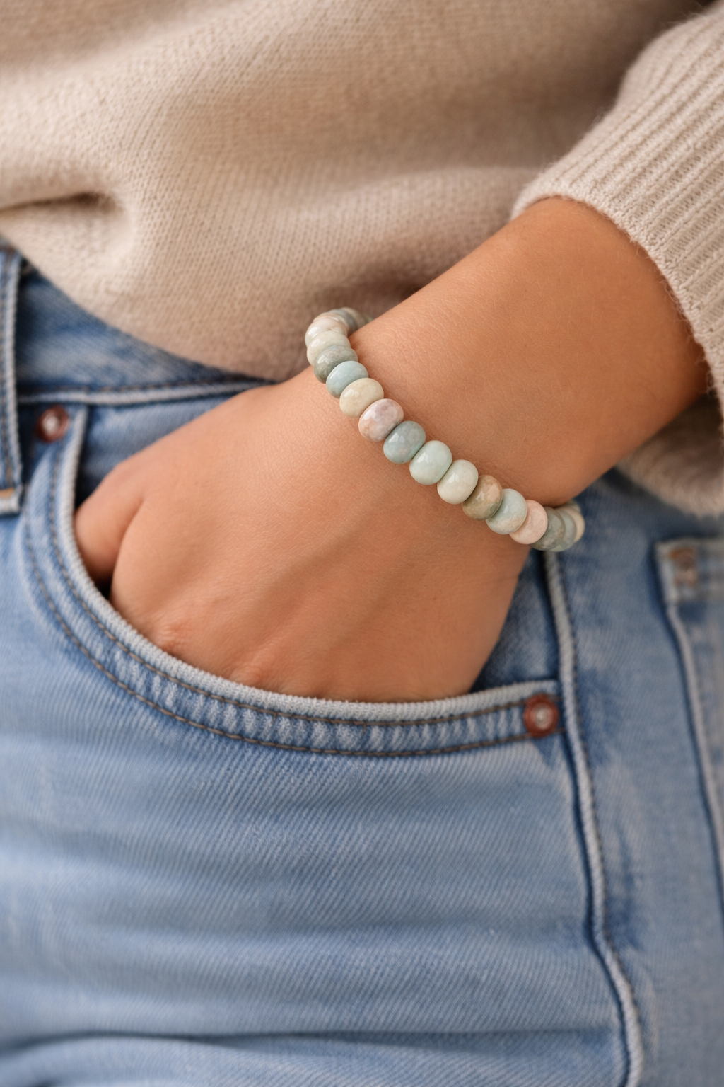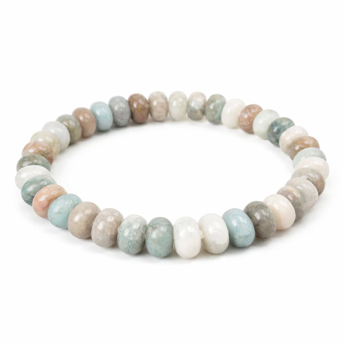 Soft, grounding, and effortlessly beautiful. This Amazonite bracelet blends soothing shades of seafoam, sand, and stone—each bead reminding you to slow down and breathe a little deeper. Known as a stone of calm and balance, Amazonite is believed to ease stress and quiet the mind. Designed to slip on easily and layer beautifully, this bracelet feels like a moment of peace you can wear every day.