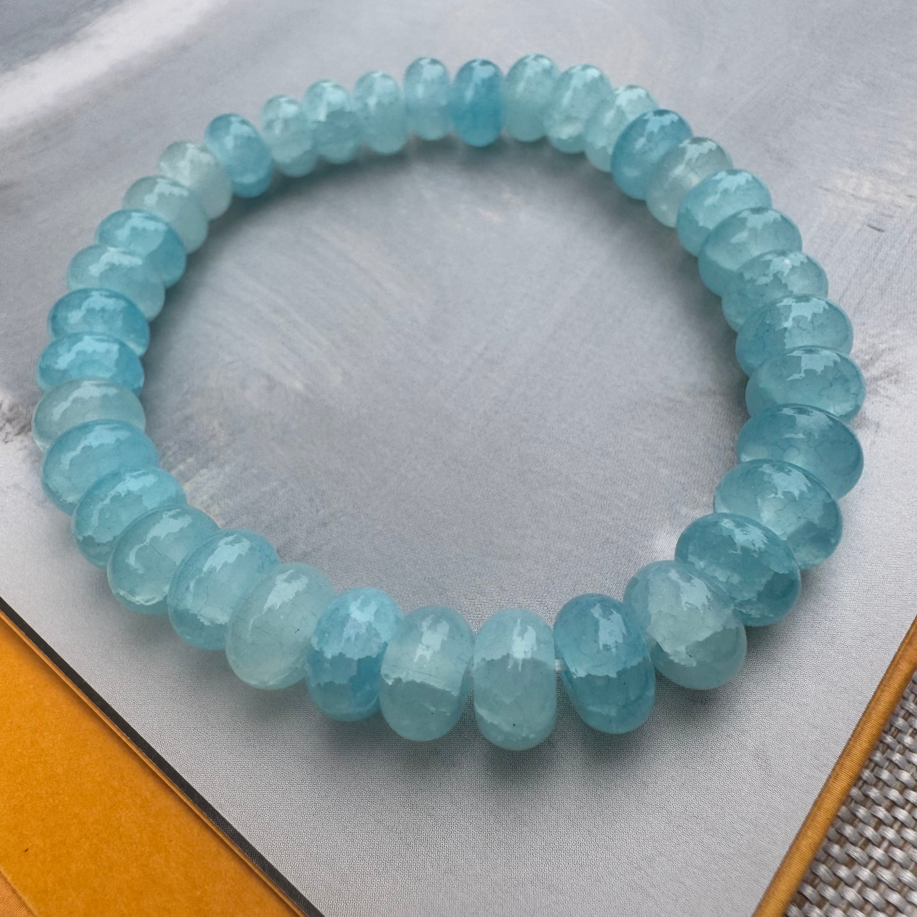 This bracelet is stunning — that cool, watery blue feels so soothing and pure, almost like light dancing on ocean waves. On a stretch cord and fits all wrist sizes!