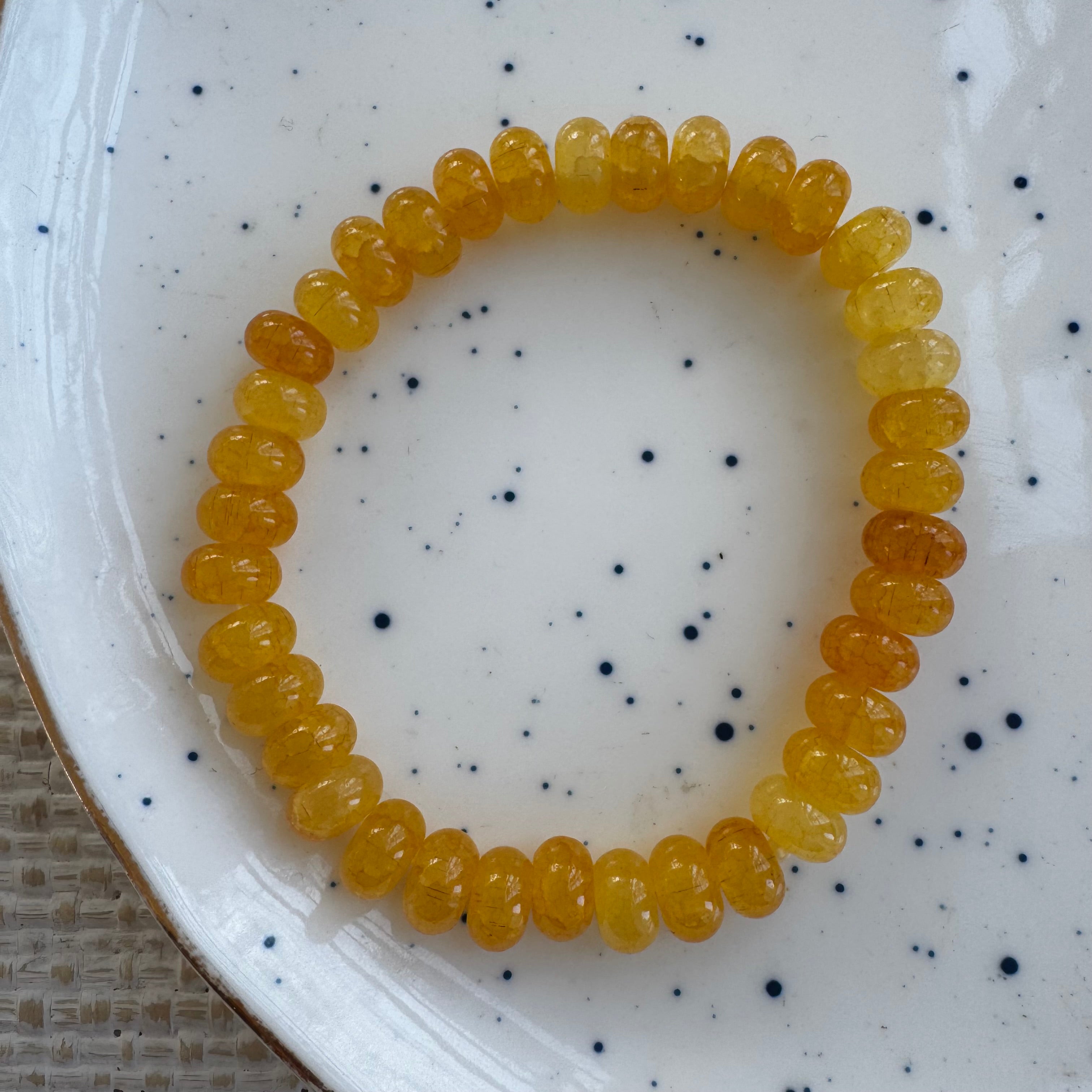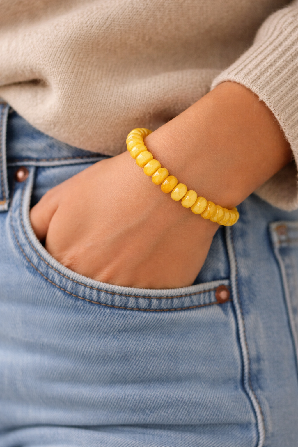 A golden yellow gemstone bracelet crafted with faceted rondelle beads that glow with warmth and light. The translucent stones feature natural texture and subtle variations, giving the bracelet depth and dimension. Strung on stretch for effortless wear, it adds a soft, sunlit pop to any stack.