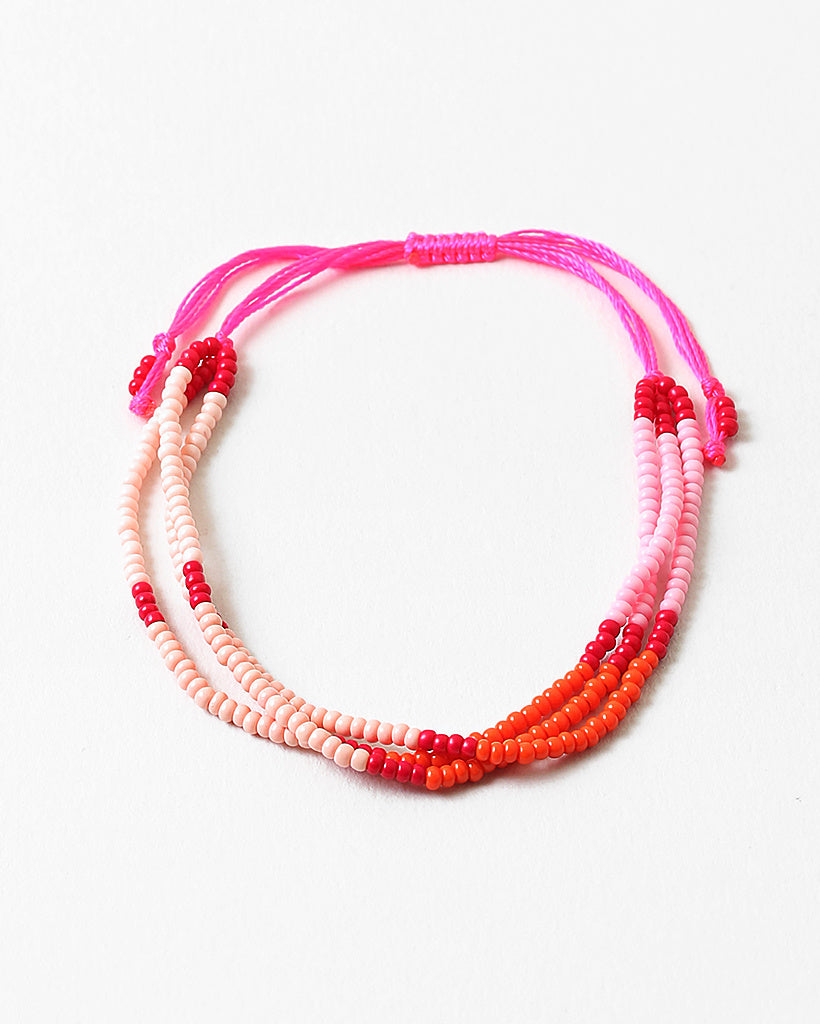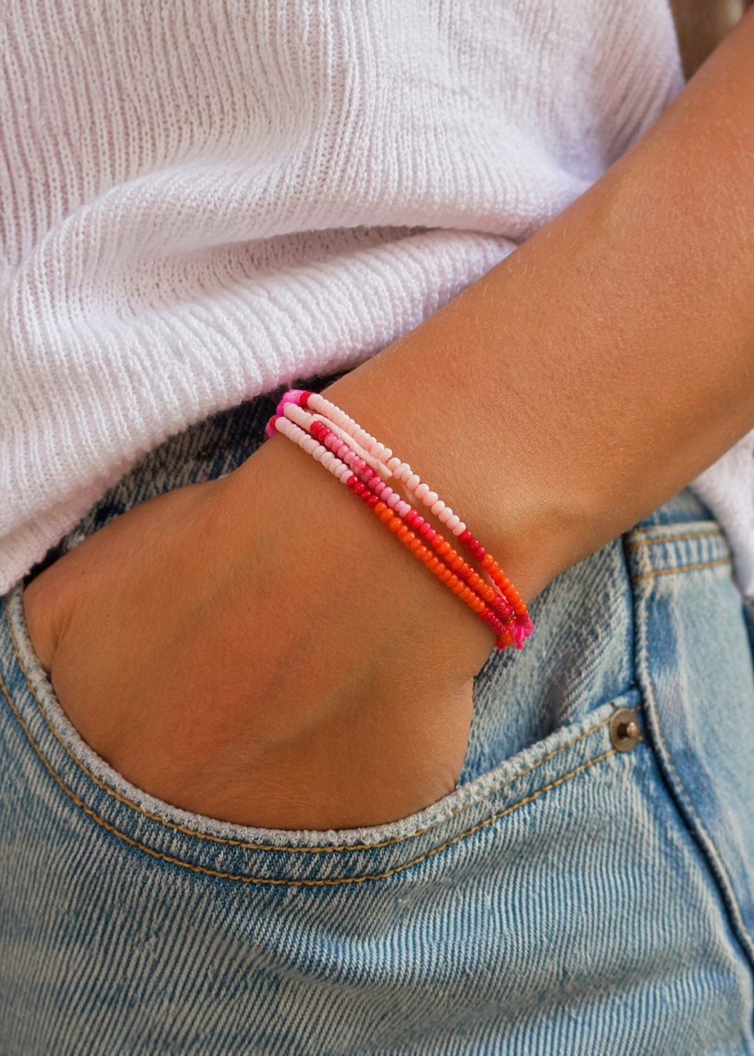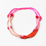 A little piece of golden hour you can wear every day. This easy, adjustable bracelet blends soft blush, vibrant coral, and pops of pink in delicate hand-strung beads—finished with a playful cord that makes it effortless to slip on and go.