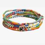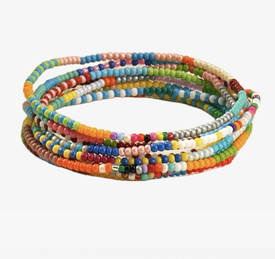 A colorful stack of 7 bracelets inspired by places you’ve been, places you’re going, and moments you never want to forget. Each bracelet is strung with vibrant beads in a mix of joyful colors—meant to be layered together or worn solo depending on your mood. Easy, effortless, and full of personality, this set feels like a little collection of memories wrapped around your wrist.