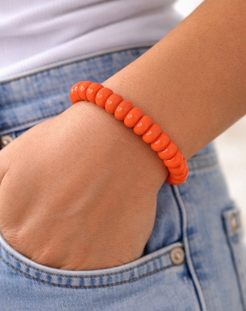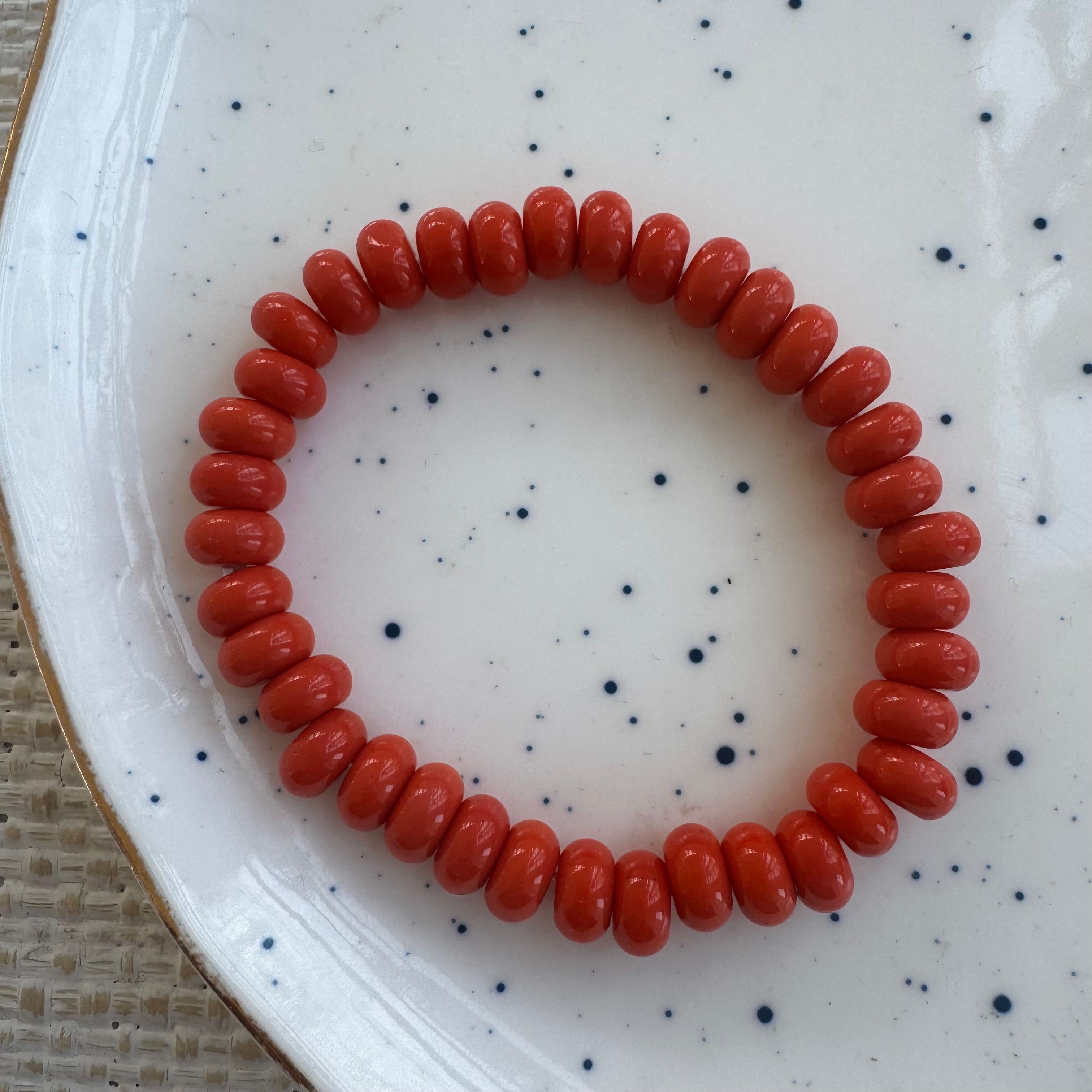 A vibrant orange gemstone bracelet made with smooth, glossy rondelle beads that radiate warmth and energy. The rich citrus hue feels bold yet wearable, adding an instant pop of color to any stack. Strung on stretch for easy, everyday wear—this bracelet is effortless, joyful, and endlessly layerable.