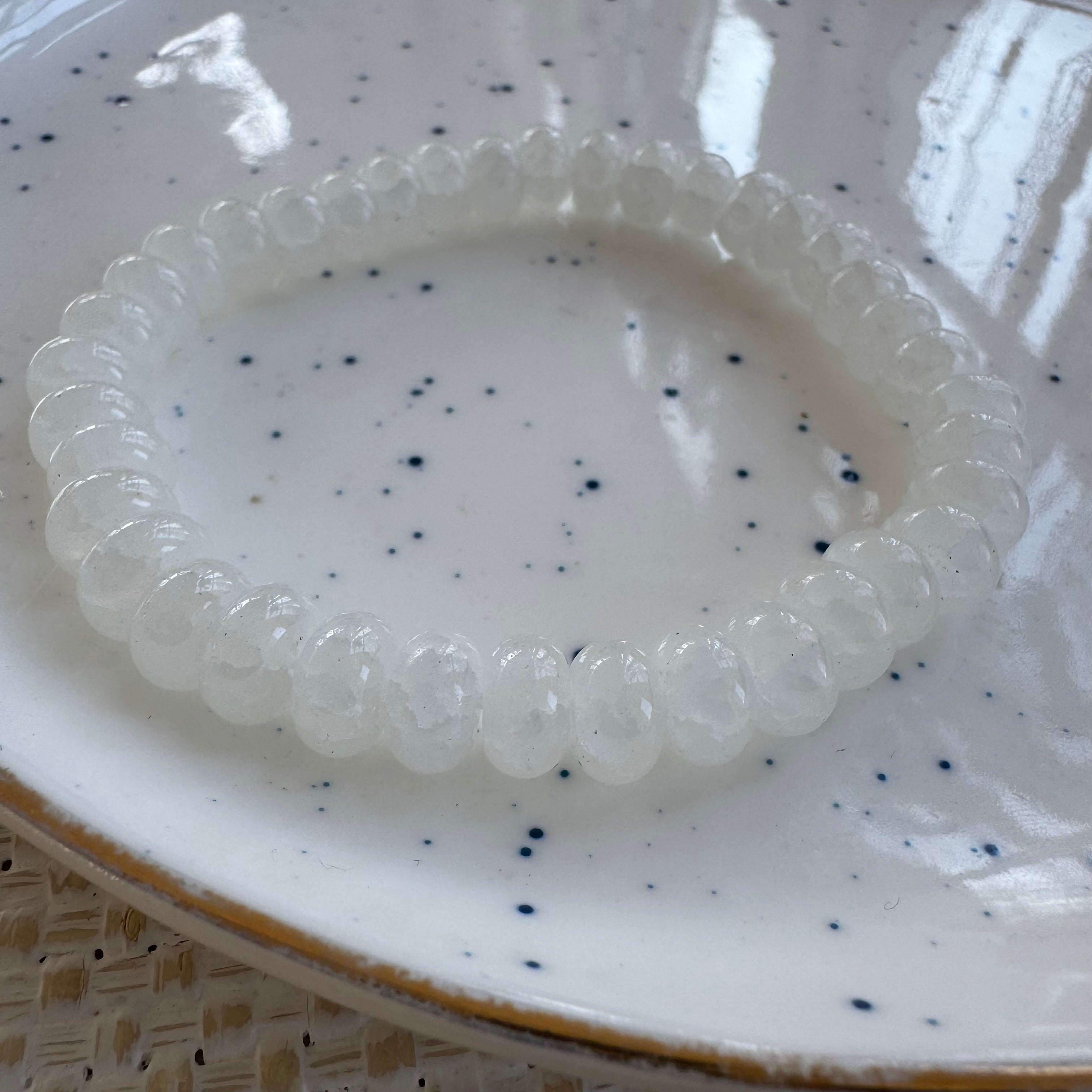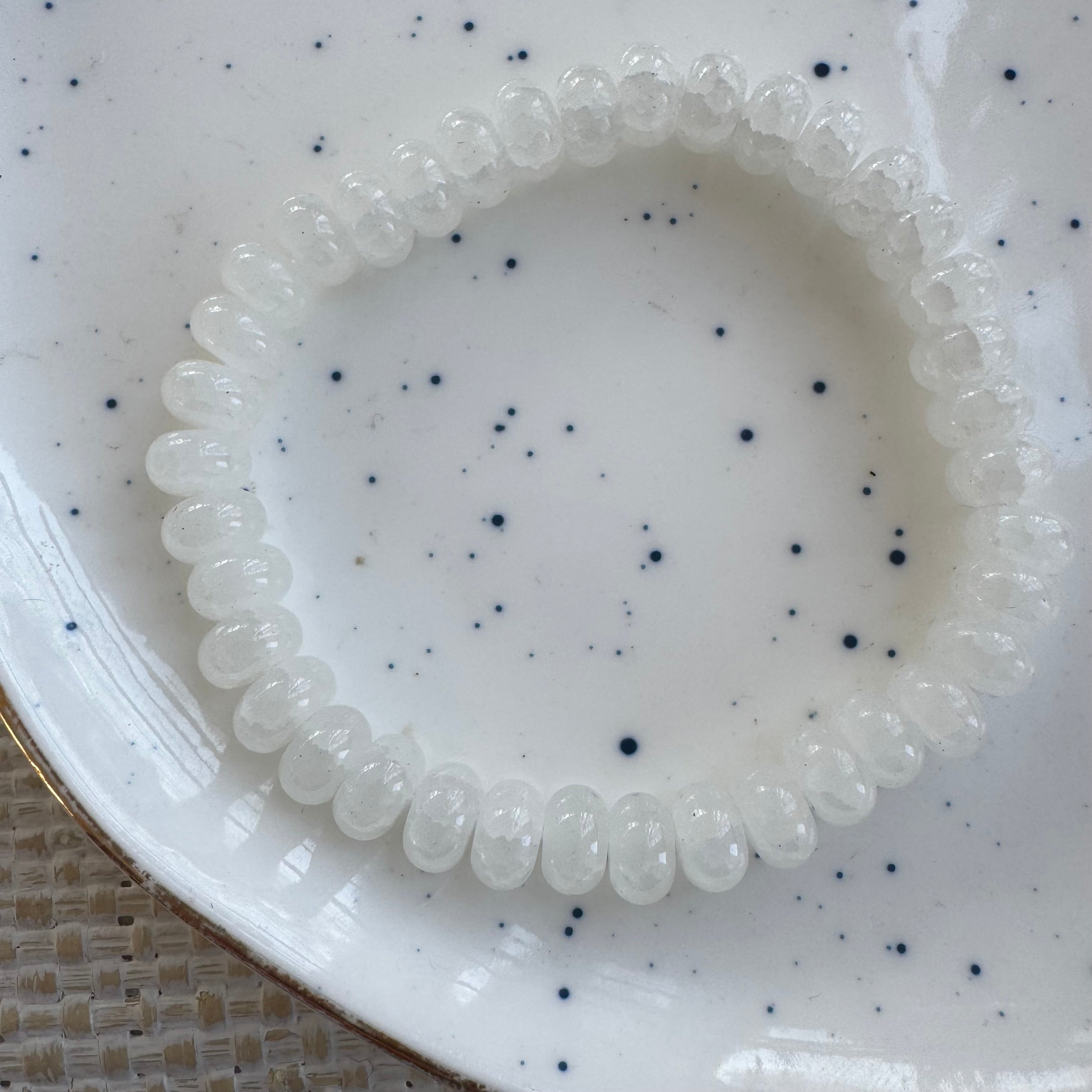 A luminous white gemstone bracelet made with softly faceted rondelle beads that catch the light with a gentle, pearly glow. The translucent stones feature natural texture and subtle variation, creating a look that feels fresh, airy, and timeless. Strung on stretch for effortless, everyday wear, this bracelet is the ultimate neutral—perfect on its own or layered with color.