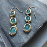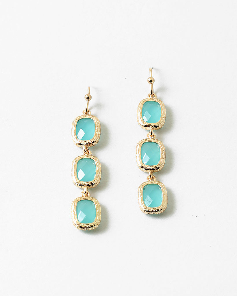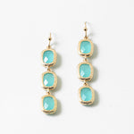 A trio of soft aqua stones set in textured gold frames creates a light-catching, elegant drop. Airy, modern, and beautifully flattering—these earrings add the perfect pop of color to any look.