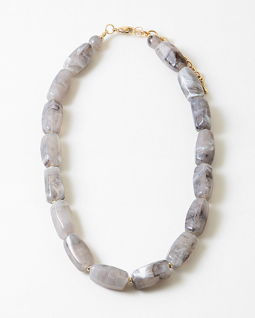 Soft swirls of gray, charcoal, and pearl-white ripple through each oversized stone, creating a stunning marbled effect that feels both grounded and ethereal. The chunky, sculpted beads make a quiet-but-confident statement—bold without being heavy, and so easy to style with cozy sweaters, crisp whites, or your favorite neutrals. Finished with tiny gold accents for just a hint of warmth, this piece brings a serene, polished beauty to any look.