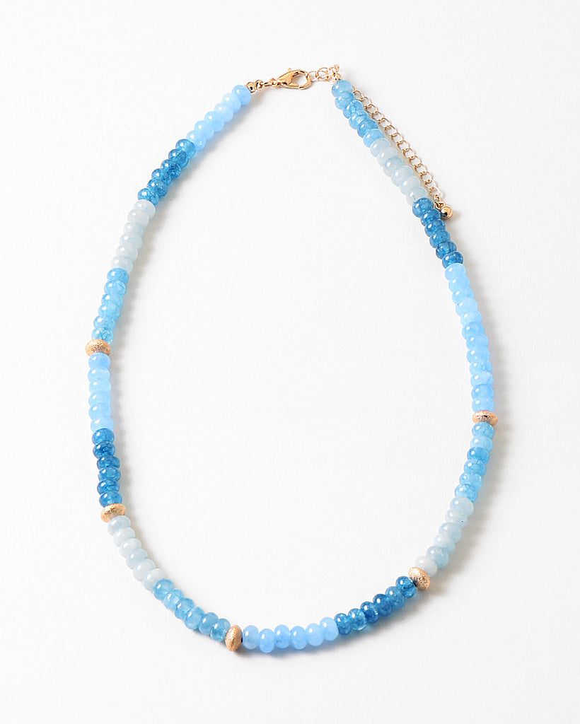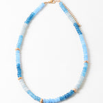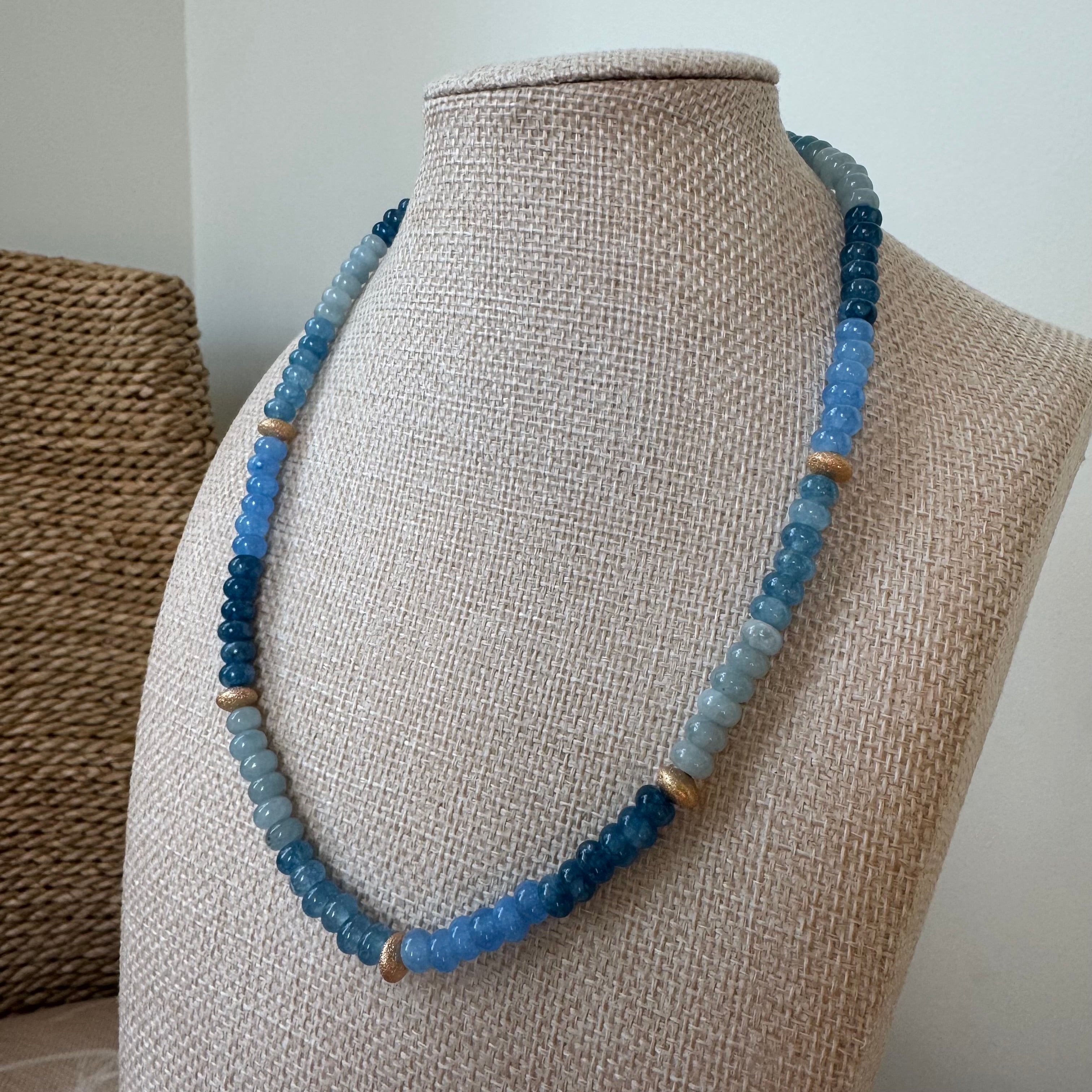 Shades of ocean blue flow effortlessly from deep teal to soft aqua, creating a calming, luminous gradient that feels like sunlight moving through water. Smooth, glassy rondelle beads give the necklace a serene, polished glow, while the textured gold accents add just the right hint of warmth and contrast. Lightweight and effortless, this piece brings a refreshing pop of color to neutrals and pairs beautifully with crisp whites, denim, and breezy knits. A stunning everyday statement for anyone who loves the blues.