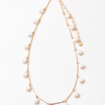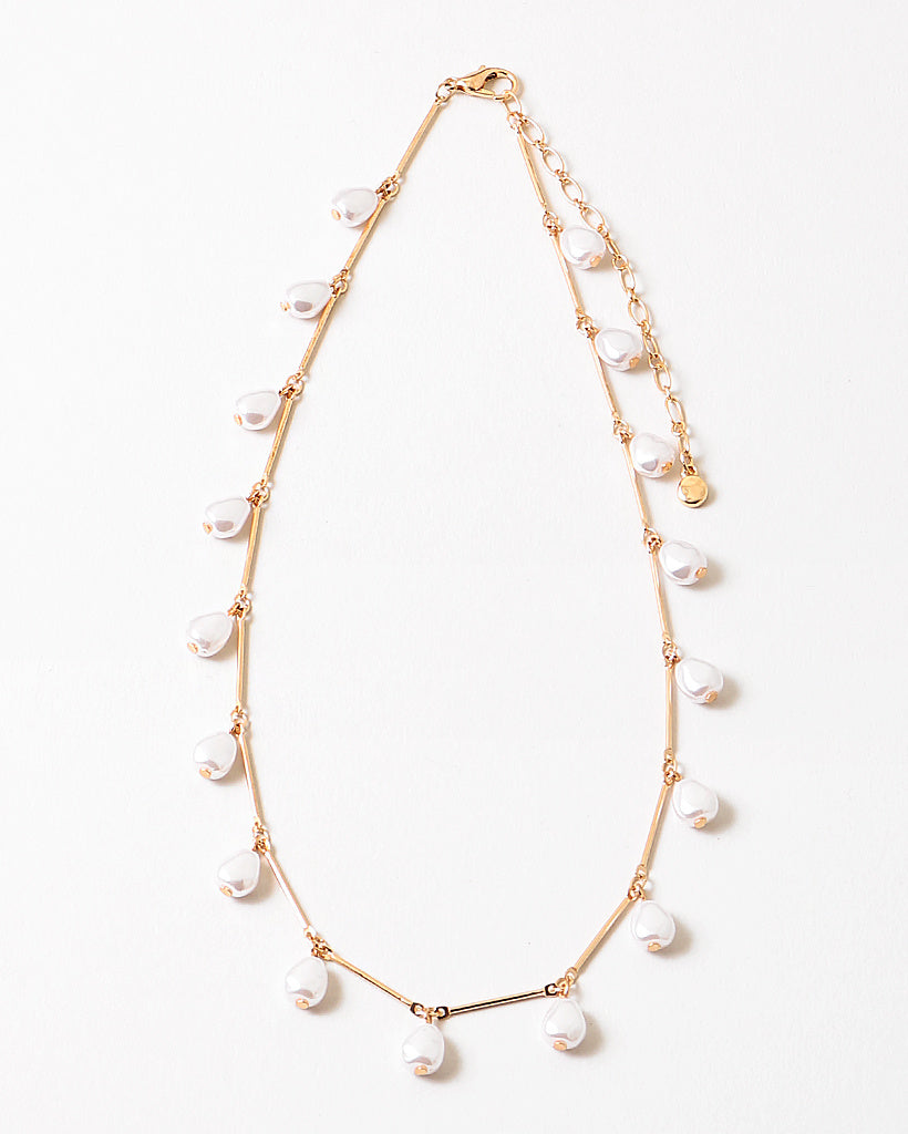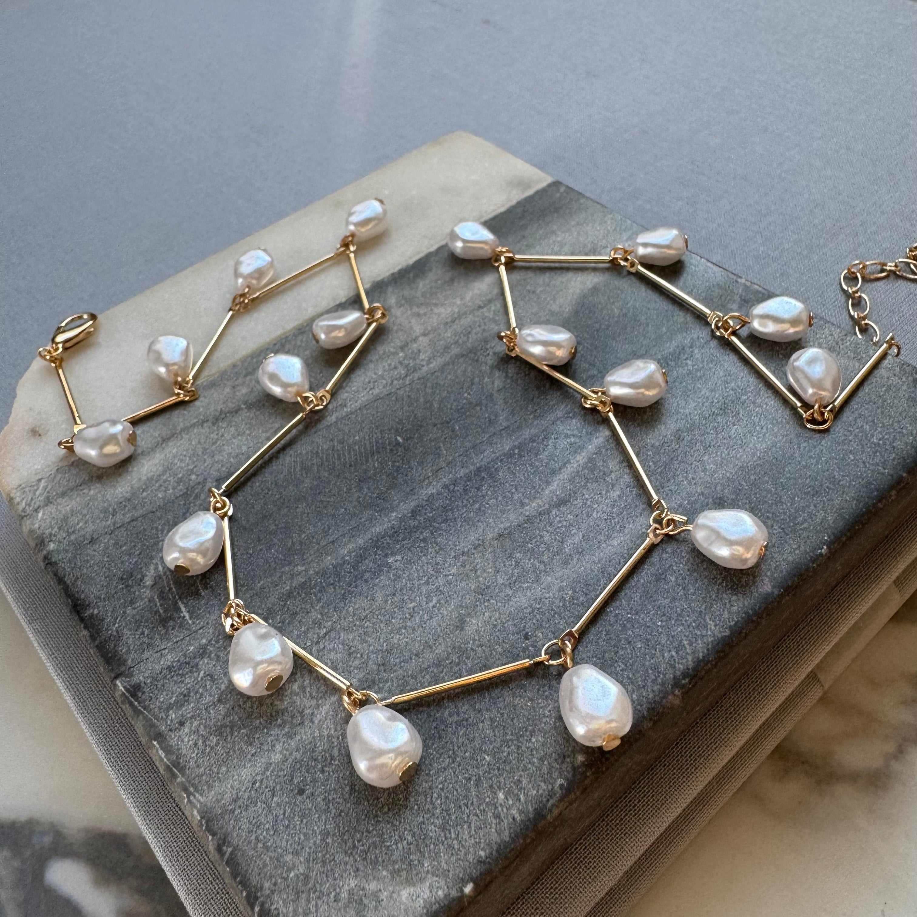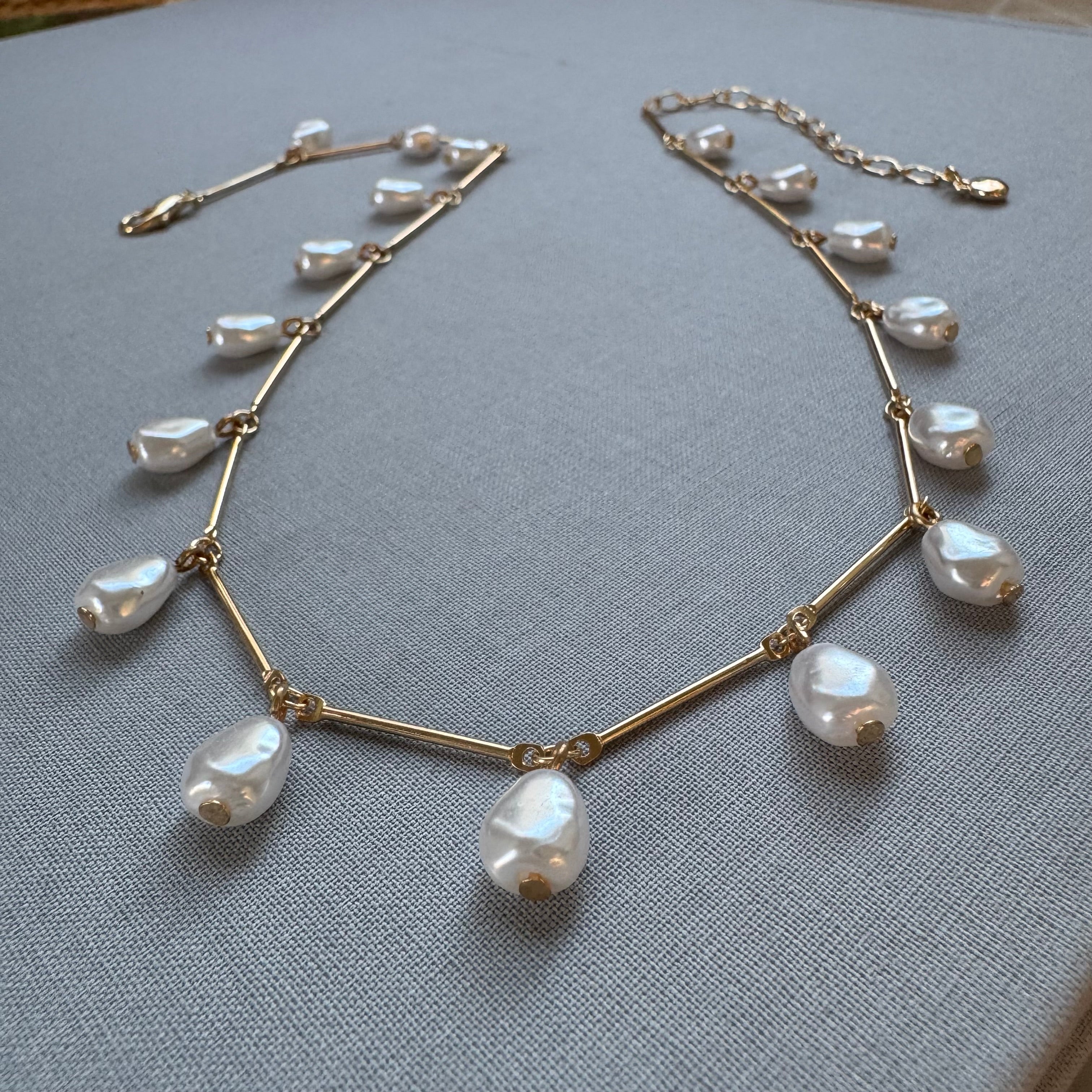 Delicate, luminous pearl drops shimmer along a sleek, linear gold chain, creating a soft, dancing movement with every turn. Each teardrop-style pearl is slightly organic, giving the necklace that effortless, modern–meets–classic feel. Lightweight and elegant, this piece is stunning on its own yet layers beautifully with your everyday chains. It’s the perfect hint of polish for holiday dinners, date nights, or elevating a simple tee.