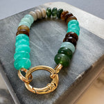This stunning stretch  bracelet  blends deep forest greens, milky creams, warm browns, and soft aqua stones into one richly textured strand. Each chunky bead adds its own organic beauty, while the front gold ring gives the piece a chic, modern finish. It’s the perfect earthy statement with a touch of luxe.