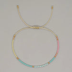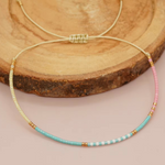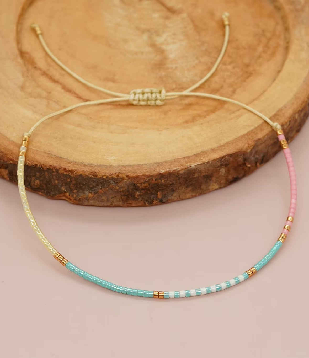 A delicate strand of pastel beads in mint, blush, sunshine yellow, and crisp white, finished with tiny gold accents for the perfect touch of shimmer. This bracelet feels light, breezy, and coastal — the kind of piece you’ll slip on every day for a little pop of happy color.