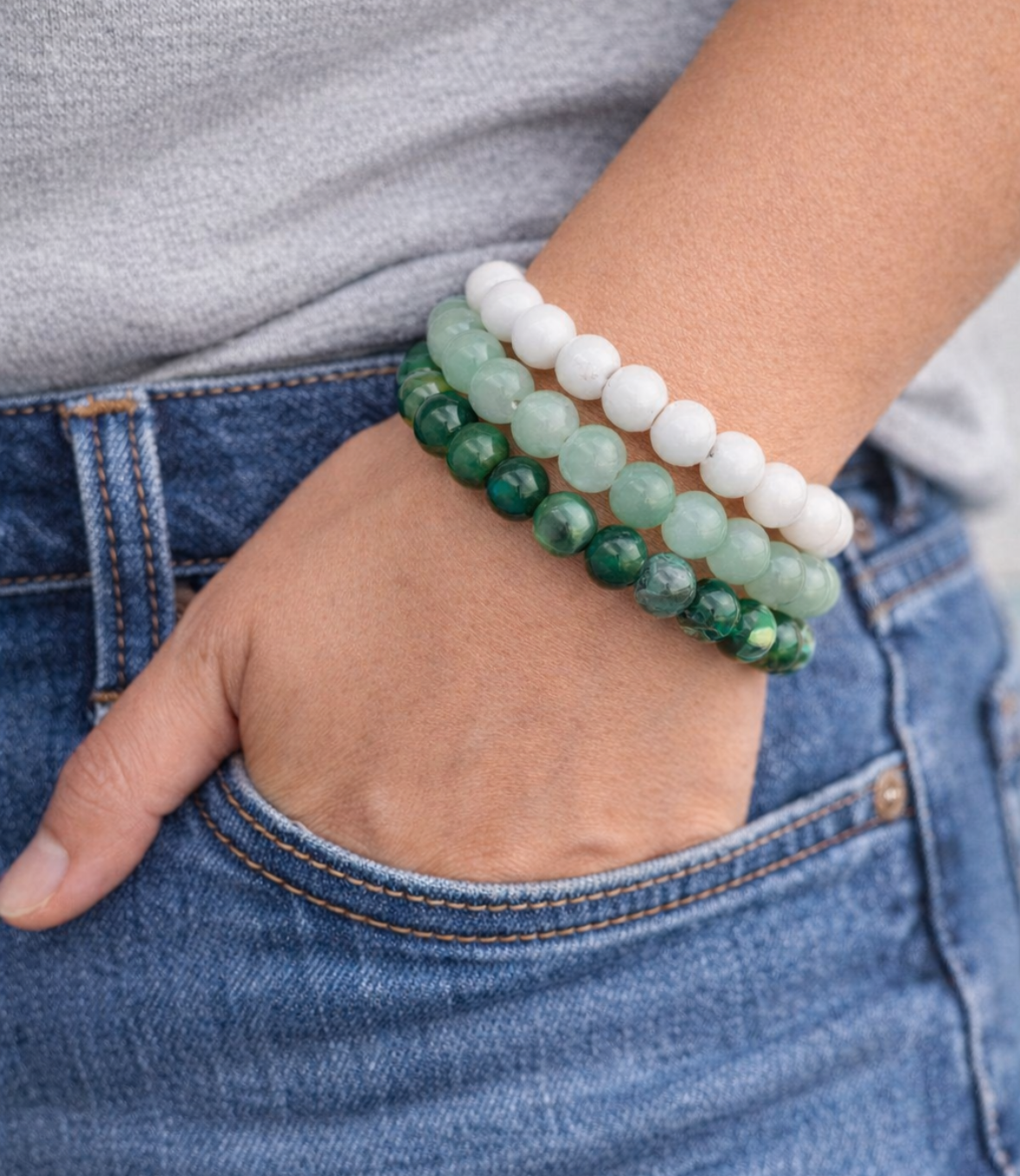 A meaningful stack of semiprecious stones—green aventurine for luck, white howlite for calm, and deep jade for grounding. A soothing everyday reminder to breathe, reset, and carry peace with you