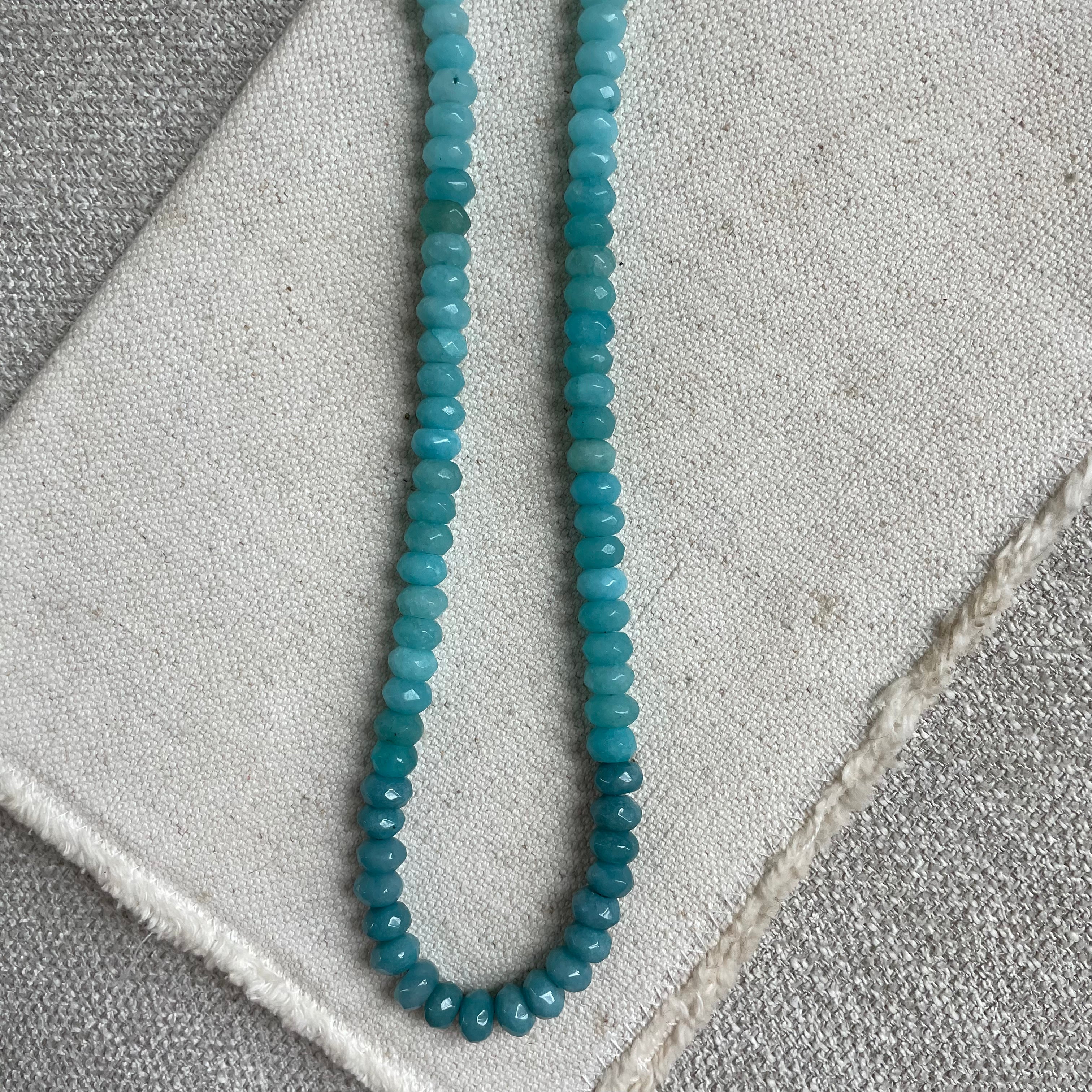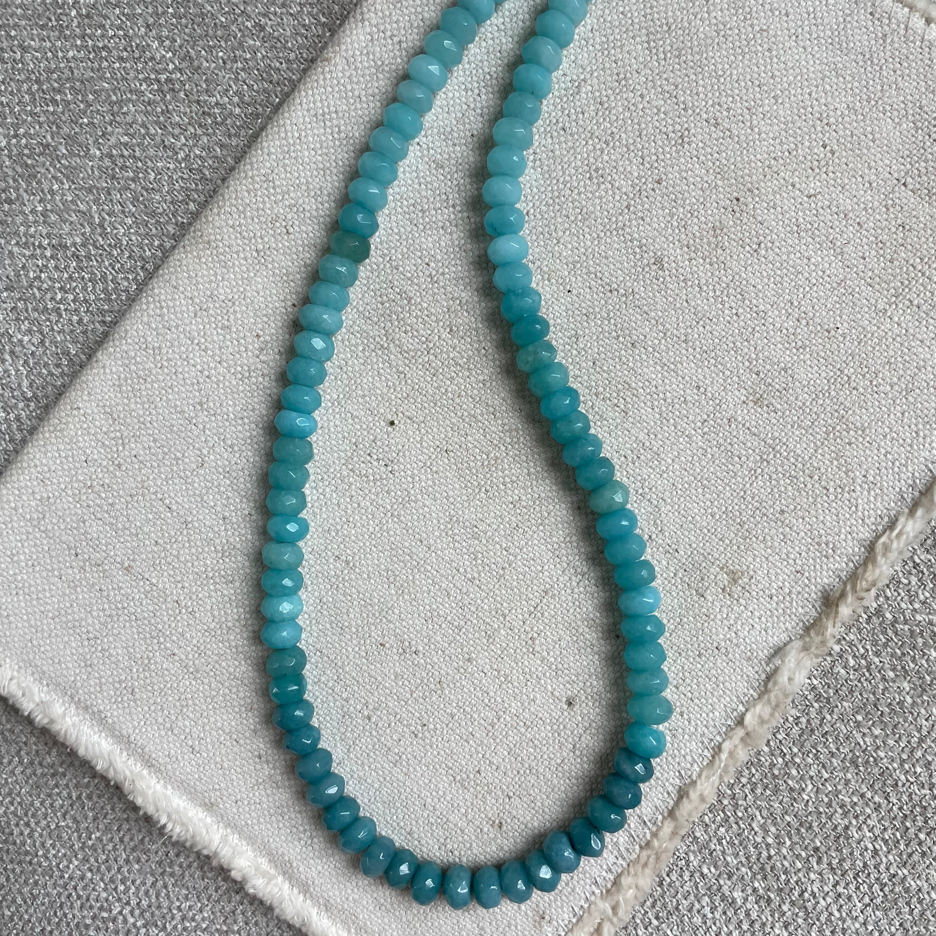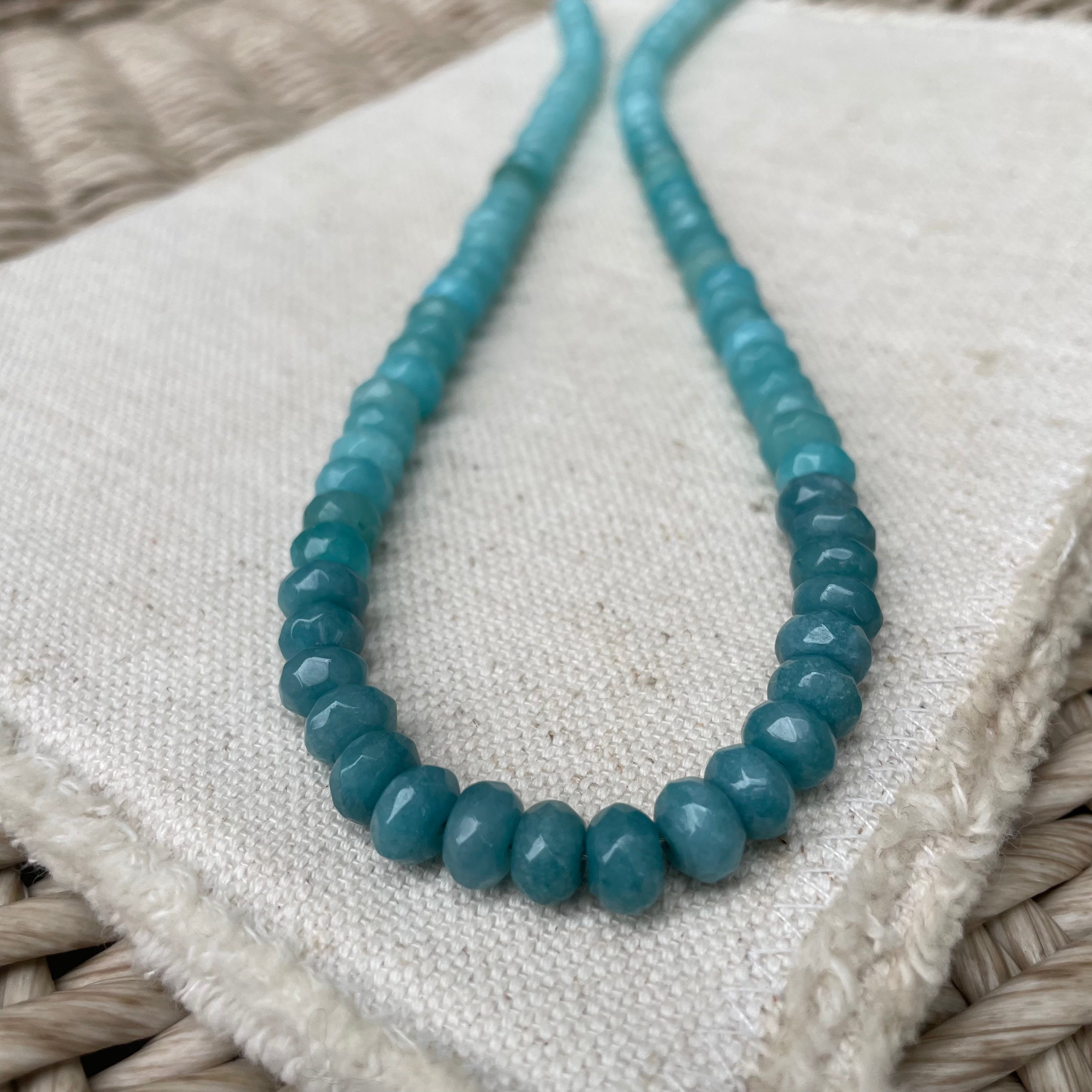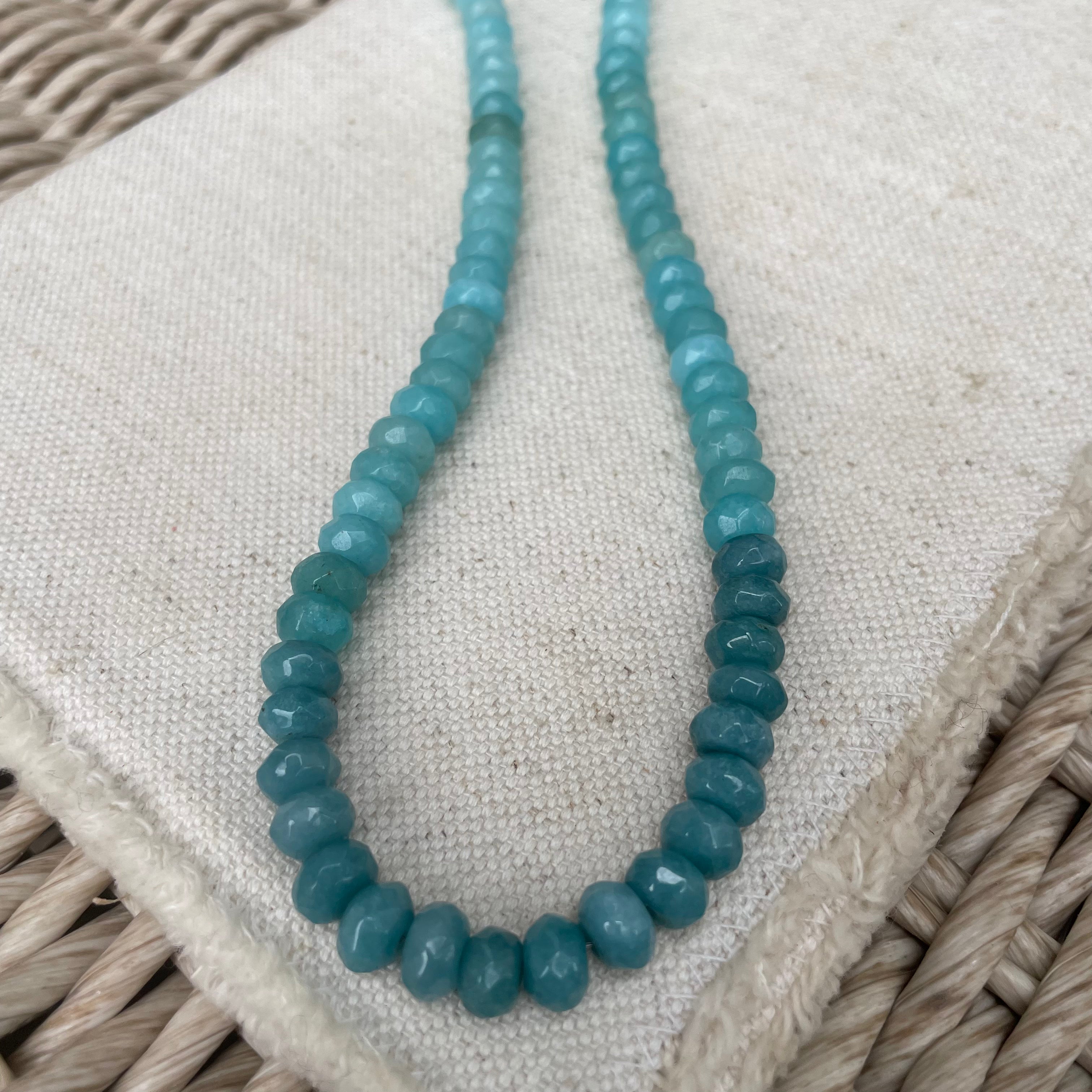 17" length + 1.5" extender - We are always drawn to these colors. Bringing back memories of travel and warm waters. The gradual ombre colorings gives a subtle twist to this piece. Pair this necklace with an array of all colors to make this one really pop!