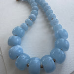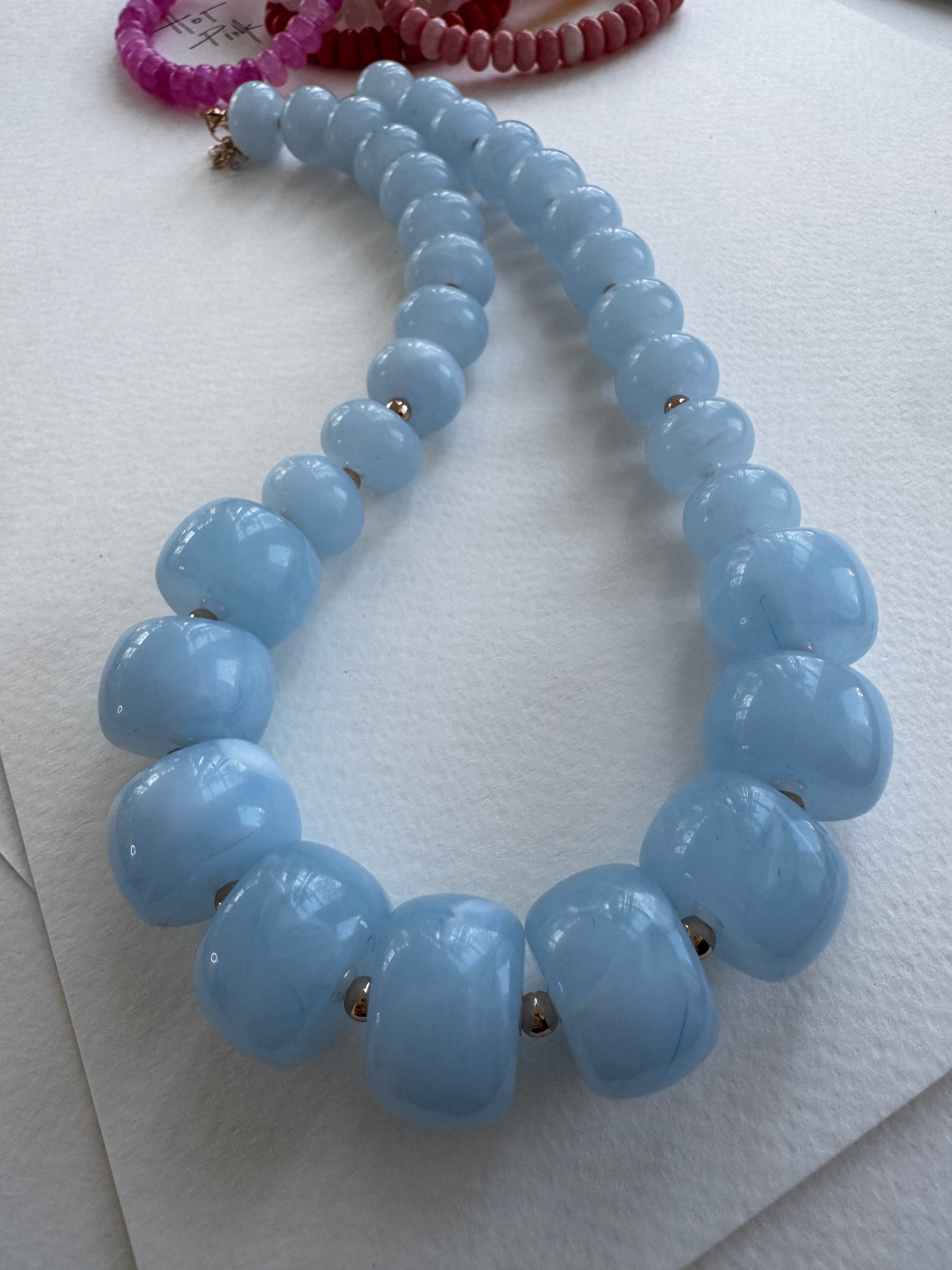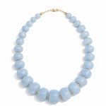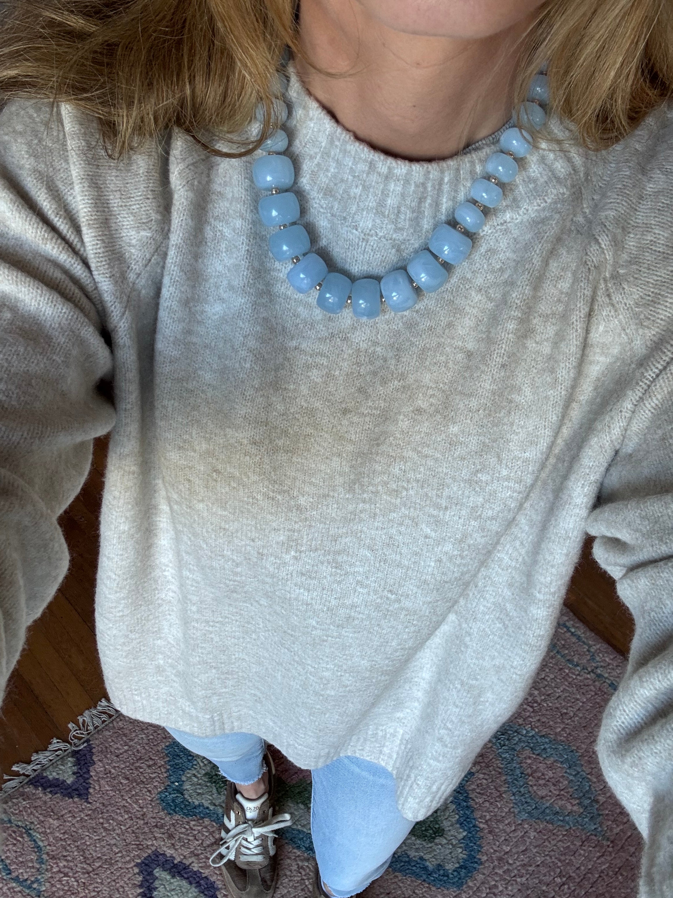 A strand of smooth, milky blue beads in a soft, cloud-like hue that catches the light with a gentle glow. The rounded stones feel substantial yet serene, creating a silhouette that’s polished but never heavy. Finished with subtle gold accents, it sits perfectly at the collarbone and elevates even the simplest white tee or cozy knit.