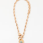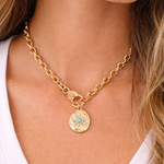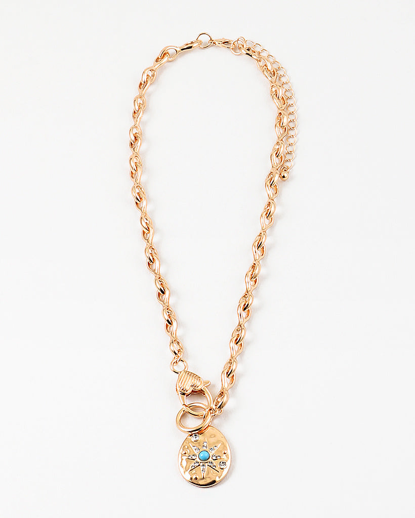 This gold chain necklace features a softly twisted link design finished with a toggle-style clasp and charm detail for an effortless, elevated look. At the center hangs a hammered oval pendant accented with a delicate starburst motif and a tiny pop of turquoise, adding just the right hint of color and meaning. The mix of texture, shine, and symbolism makes this piece feel both classic and special — perfect worn solo as a statement or layered with your everyday favorites.