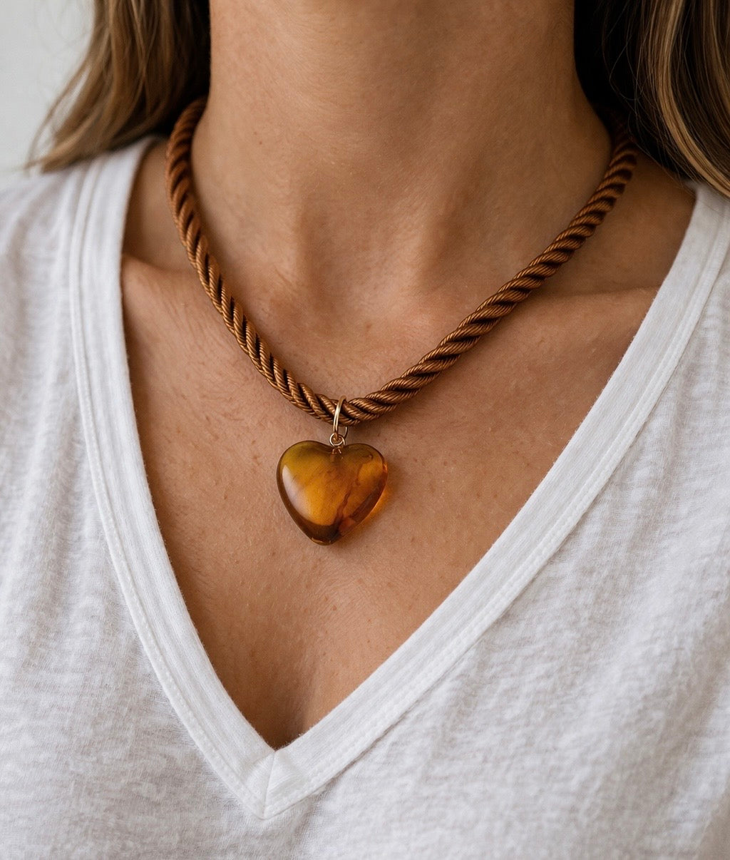 A beautifully balanced mix of texture and warmth, this necklace features a rich, twisted rope cord finished with a glowing heart pendant in soft golden amber tones. Each heart has natural variations that make every piece feel one-of-a-kind, catching the light with an effortless, sun-warmed glow.
