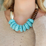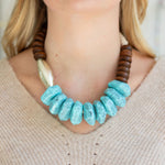 17” and the coolest mix of materials! Made from a cream cord, smooth wood, textured gold and turquoise resin…this piece might be the coolest statement necklace that we carry in our collection!