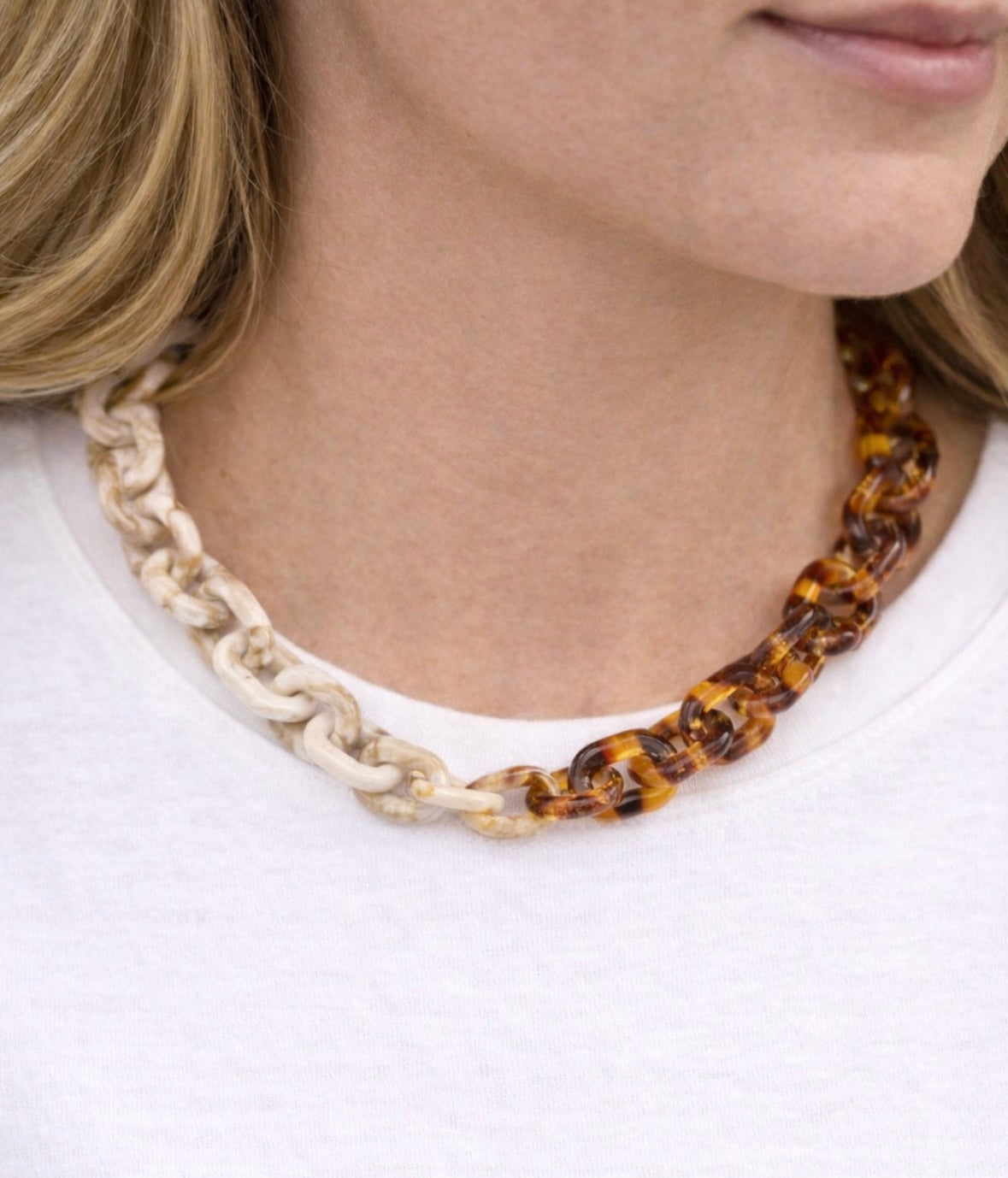 A striking mix of warm amber links and soft marbled ivory chains creates an effortless, modern statement. Lightweight and bold, this two-tone piece adds instant personality to any look.