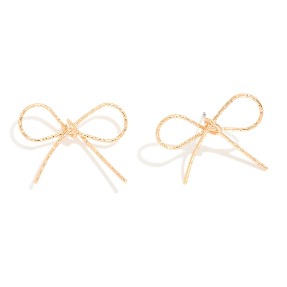 .5” in length and just as sweet as they can be. Elevate your everyday look with these lovely textured delicate bow studs. Versatility and effortless to fit easily into your jewelry collection.