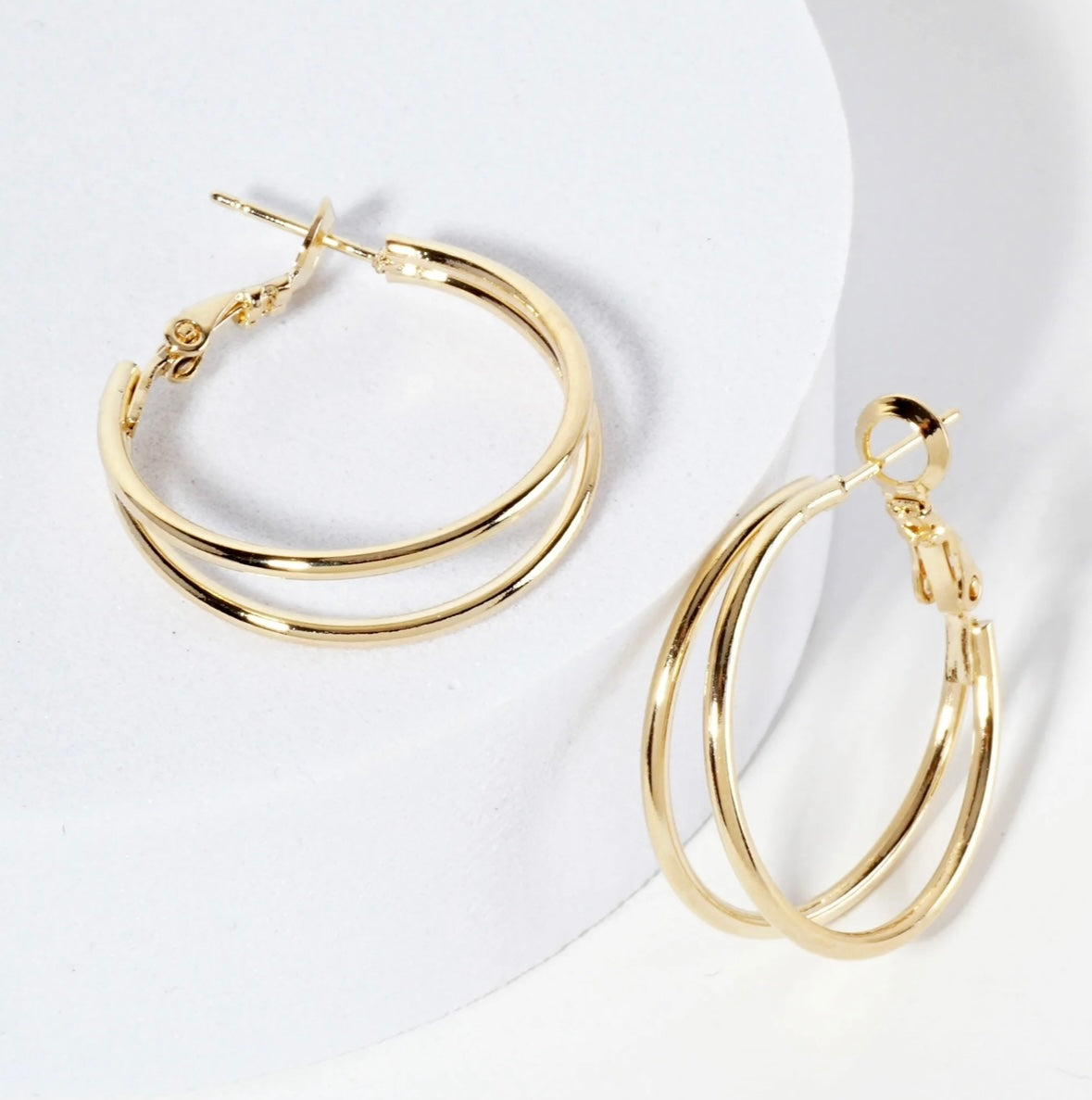 Your new go-to everyday hoops. These double-band gold earrings give the look of two perfect hoops in one lightweight, effortless design. Polished, modern, and incredibly easy to throw on with anything — they’re the kind of hoops that instantly pull an outfit together.