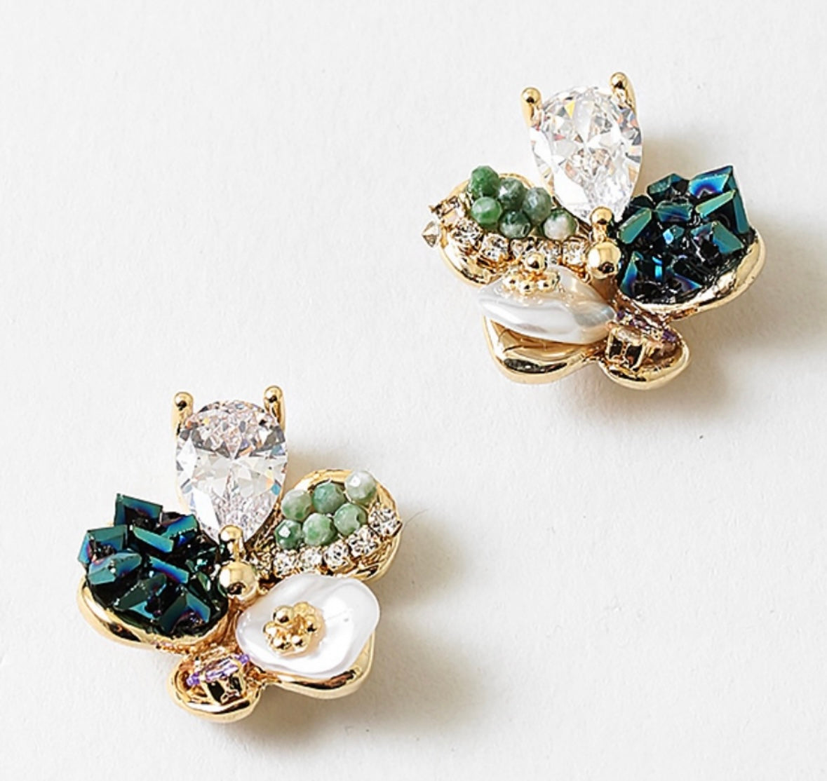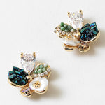 These dimensional floral studs bring together shimmering crystal, iridescent midnight stones, soft jade beads, and a delicate mother-of-pearl petal. Each pair feels like a tiny garden captured in gold — vibrant, sculptural, and full of sparkle. Lightweight and elegant, they add a hint of magic to everyday outfits and special occasions alike.