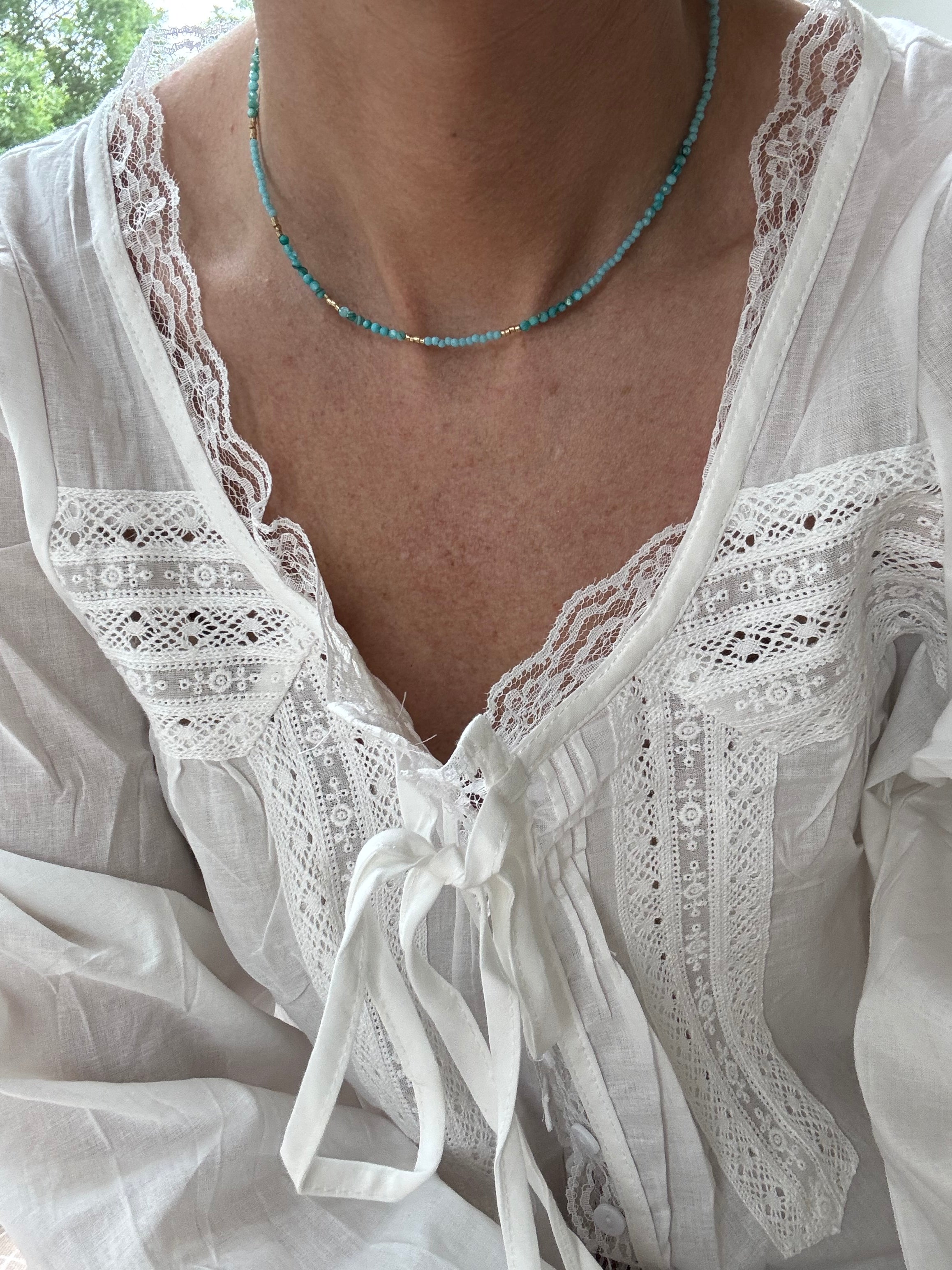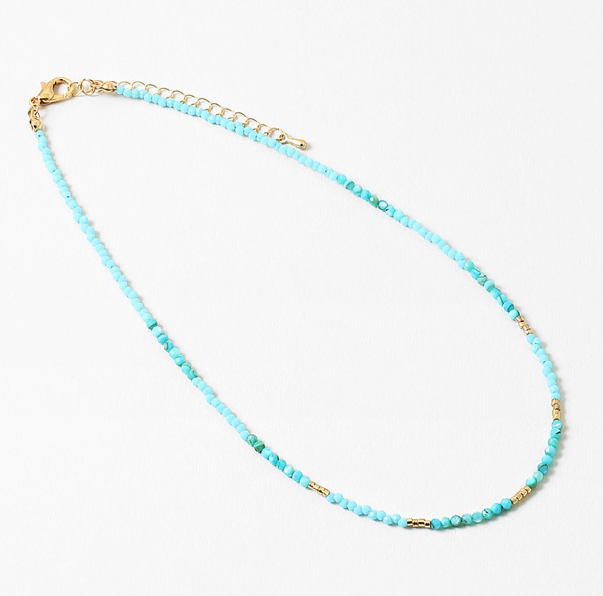 The most gorgeous shade of blue with tiny gold beads throughout the necklace!! This color is absolutely gorgeous and looks perfect for everyday wear!