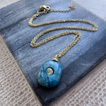 A smooth, ocean-hued stone accented with a single sparkling center, like sunlight dancing on the sea. The organic shape keeps it effortless and natural, while the gold chain adds just the right touch of polish. It’s a piece that feels grounding, protective, and quietly bold all at once.
