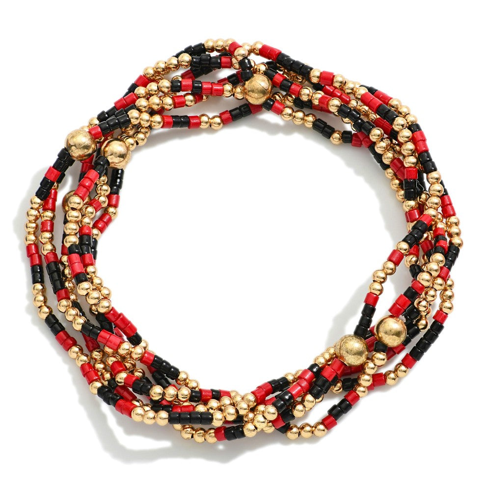 A bold bracelet bundle featuring alternating black and red beads, accented with warm gold details for a striking contrast. Designed to feel confident yet easy, this stretchy stack adds depth and dimension to any look. Timeless with a modern edge, it’s perfect for elevating everyday outfits or adding a statement touch to evening wear.