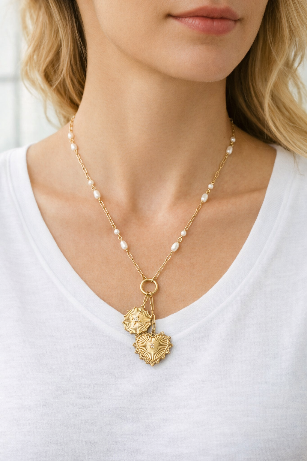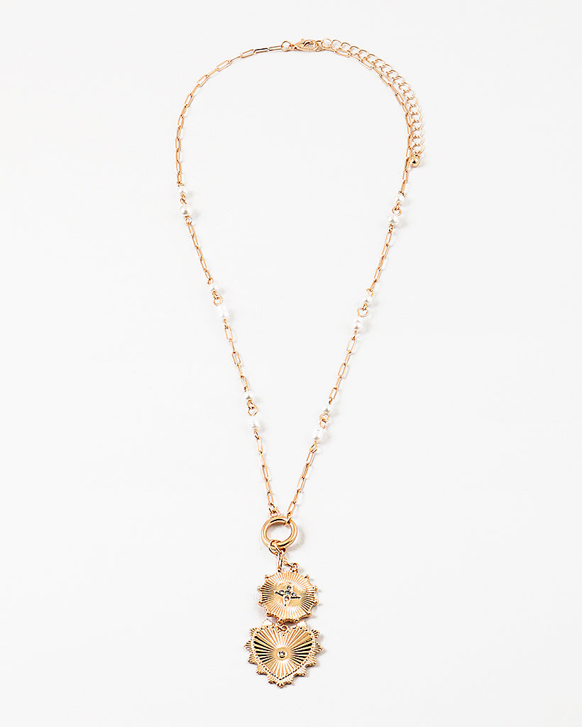 The Carry My Heart Necklace blends elongated gold links with delicate faux pearls, finished with two radiant heart medallions that dance softly at the center. Equal parts romantic and strong, it layers effortlessly over a crisp white tee or dresses up for evenings out. It’s the kind of piece that feels like a treasure you’ve collected on your travels — timeless, luminous, and full of story