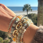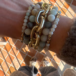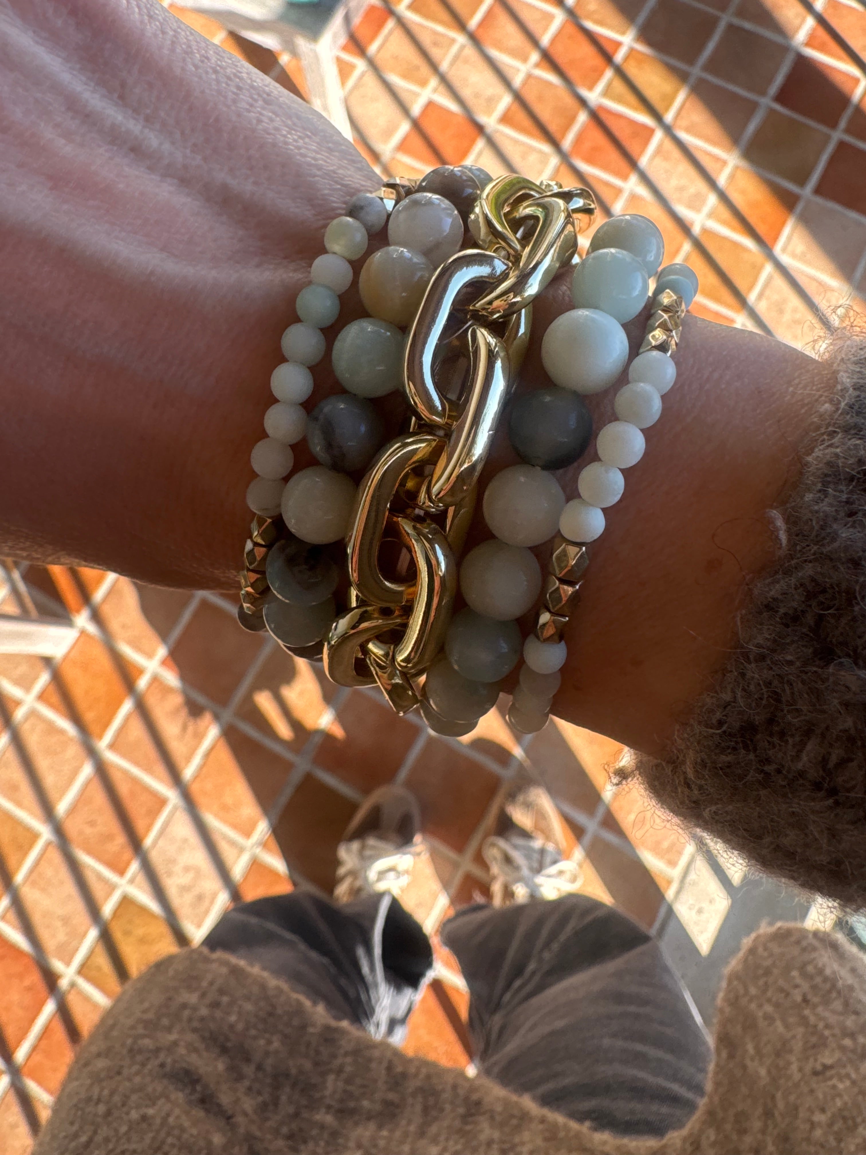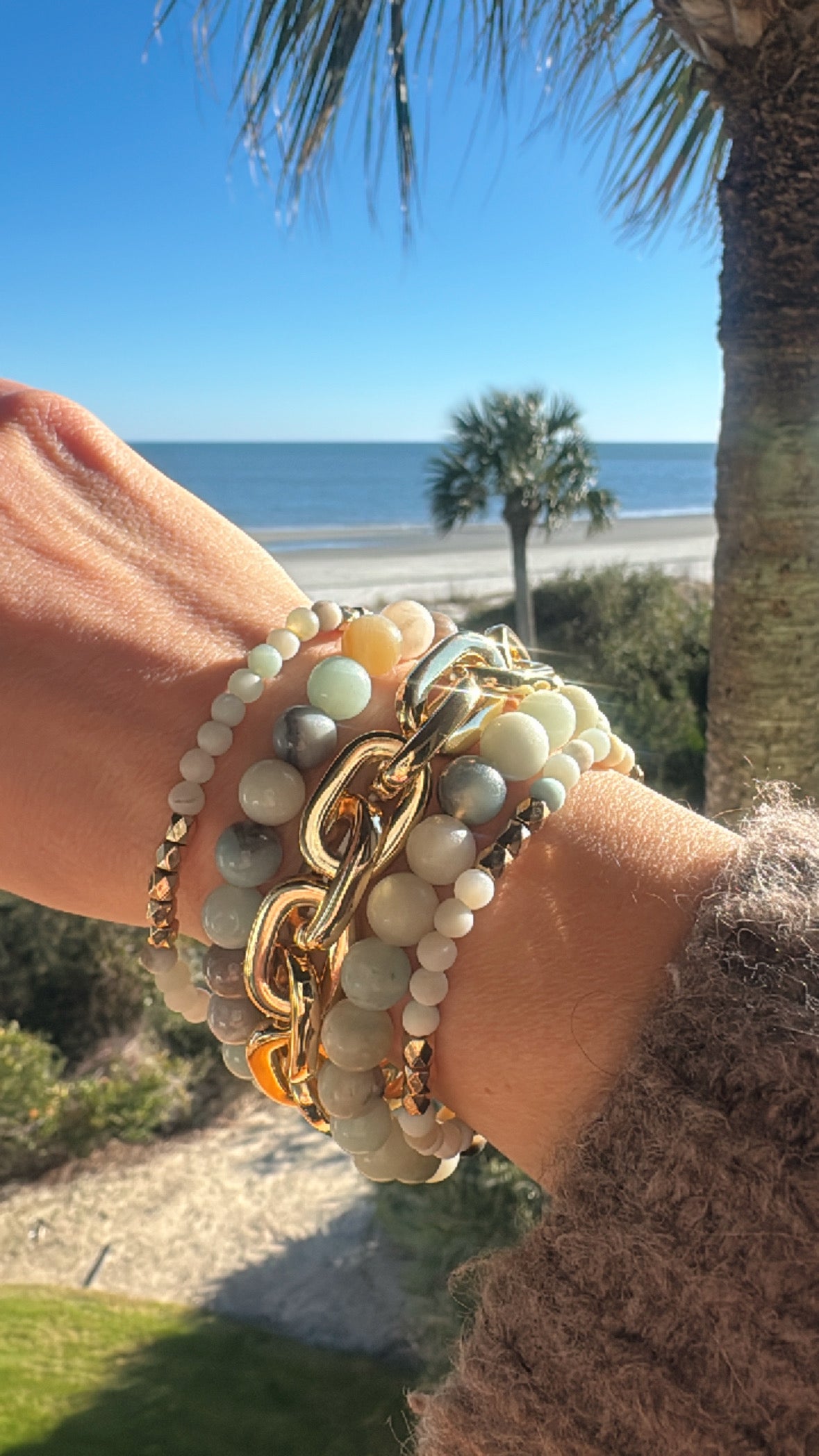 This bundle brings together calming stone tones and a statement gold chain for a look that feels both relaxed and intentional. Easy to slip on and endlessly wearable, it’s designed to move with you from everyday errands to dressed-up moments. A true reflection of loving what you love. This bundle includes 5 favorite bracelets. Our signature gold link bracelet in the middle anchors the gold and Amazonite bracelets on either side.
