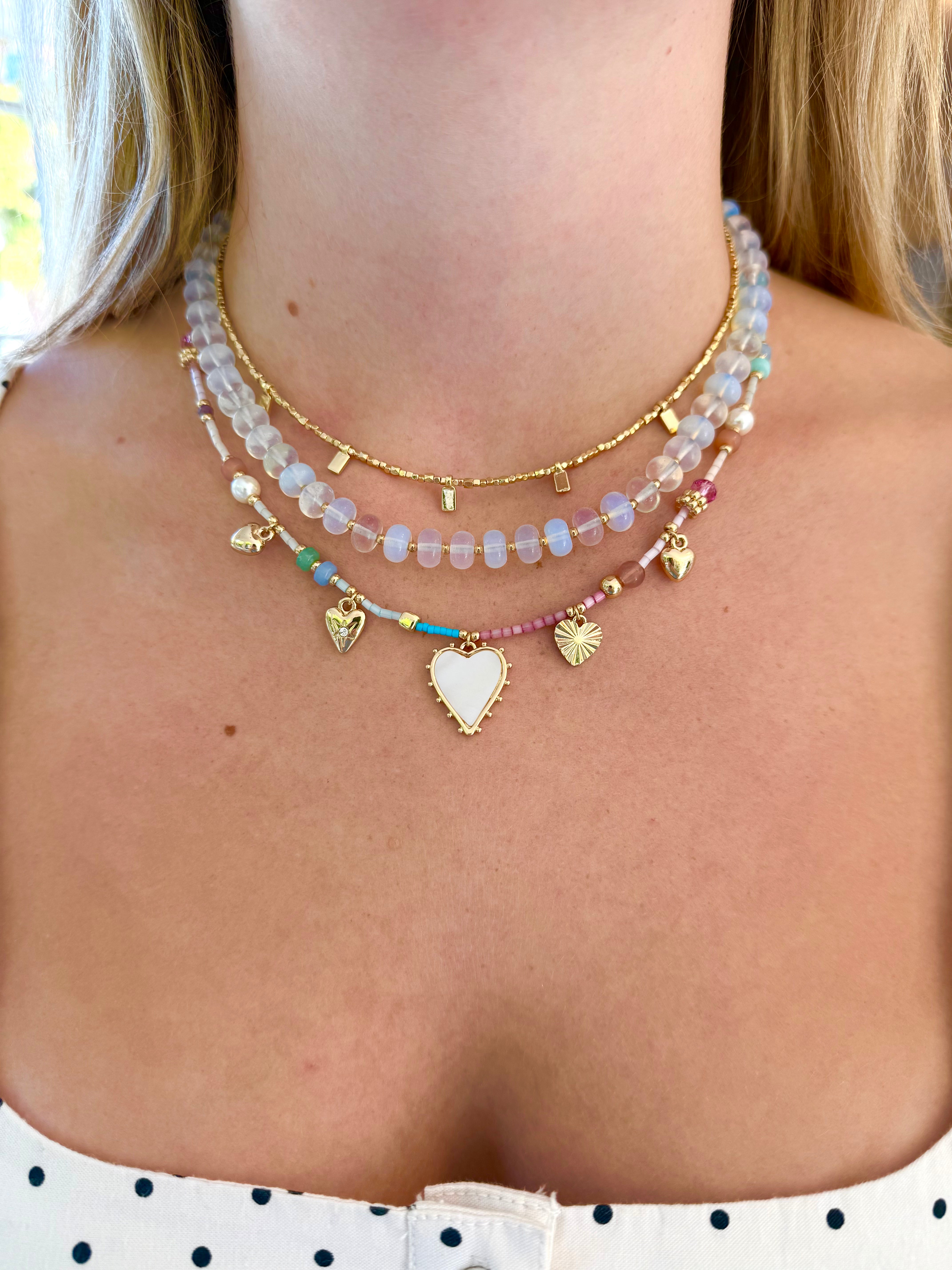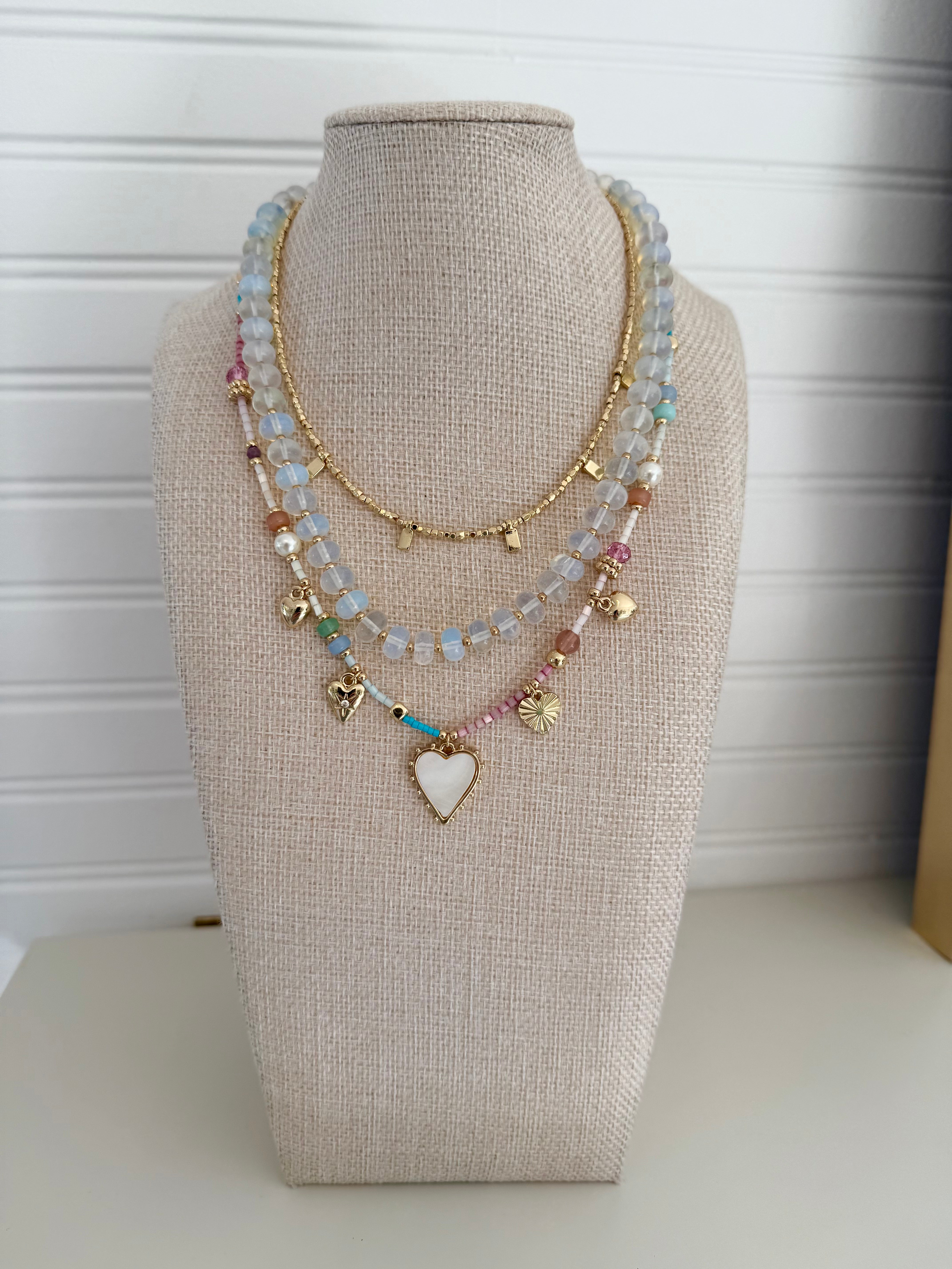 -A mix of hearts, charms, dreamy colors and textures makes this new necklace one that we will have on rotation!