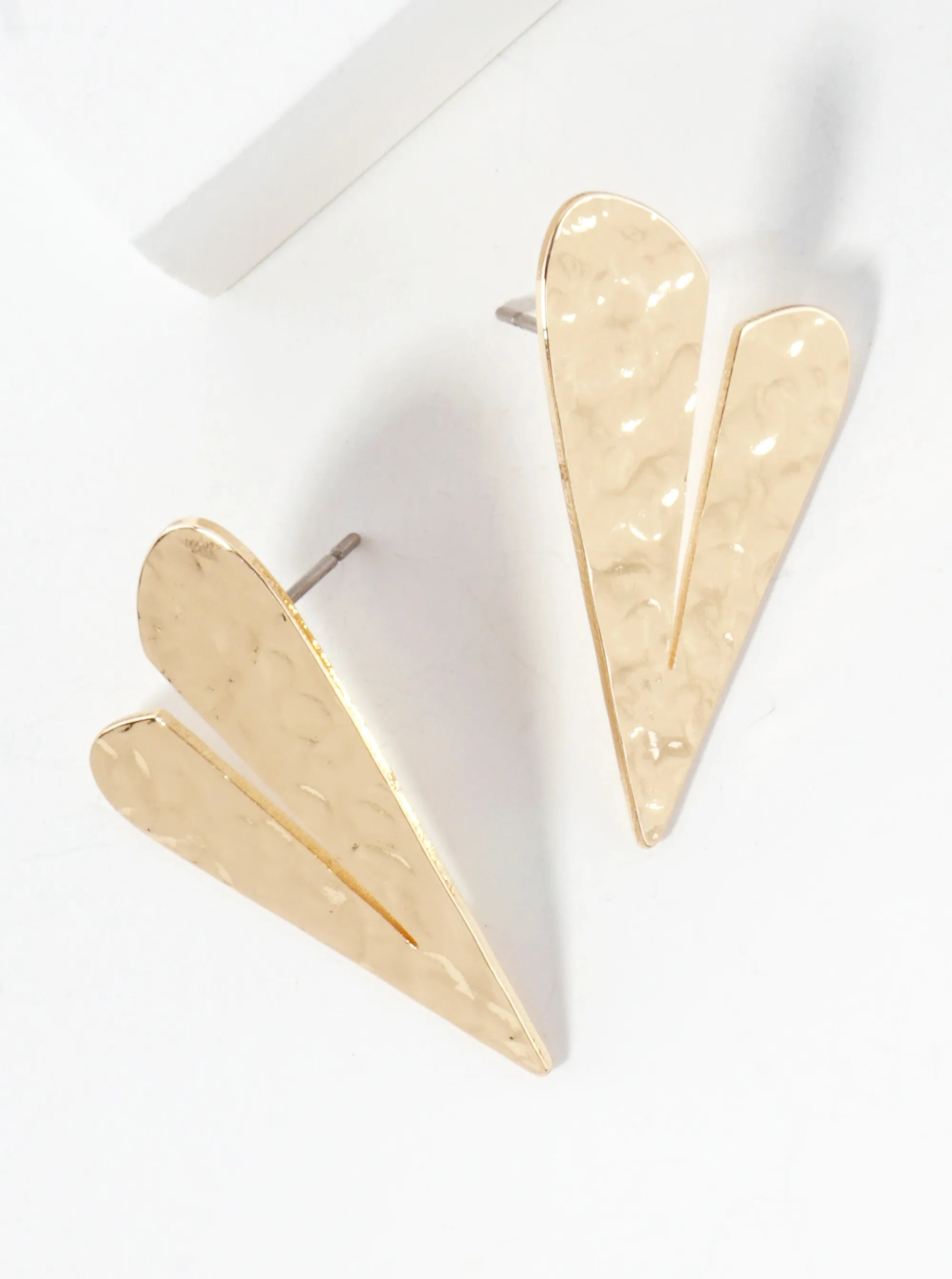 These luminous hammered-gold studs feel like soft, sculpted petals caught mid-flutter. Lightweight and eye-catching, they sit beautifully along the ear and bring an effortless glow to any look. A perfect blend of modern art and organic movement—easy enough for every day, yet special enough to elevate any moment.