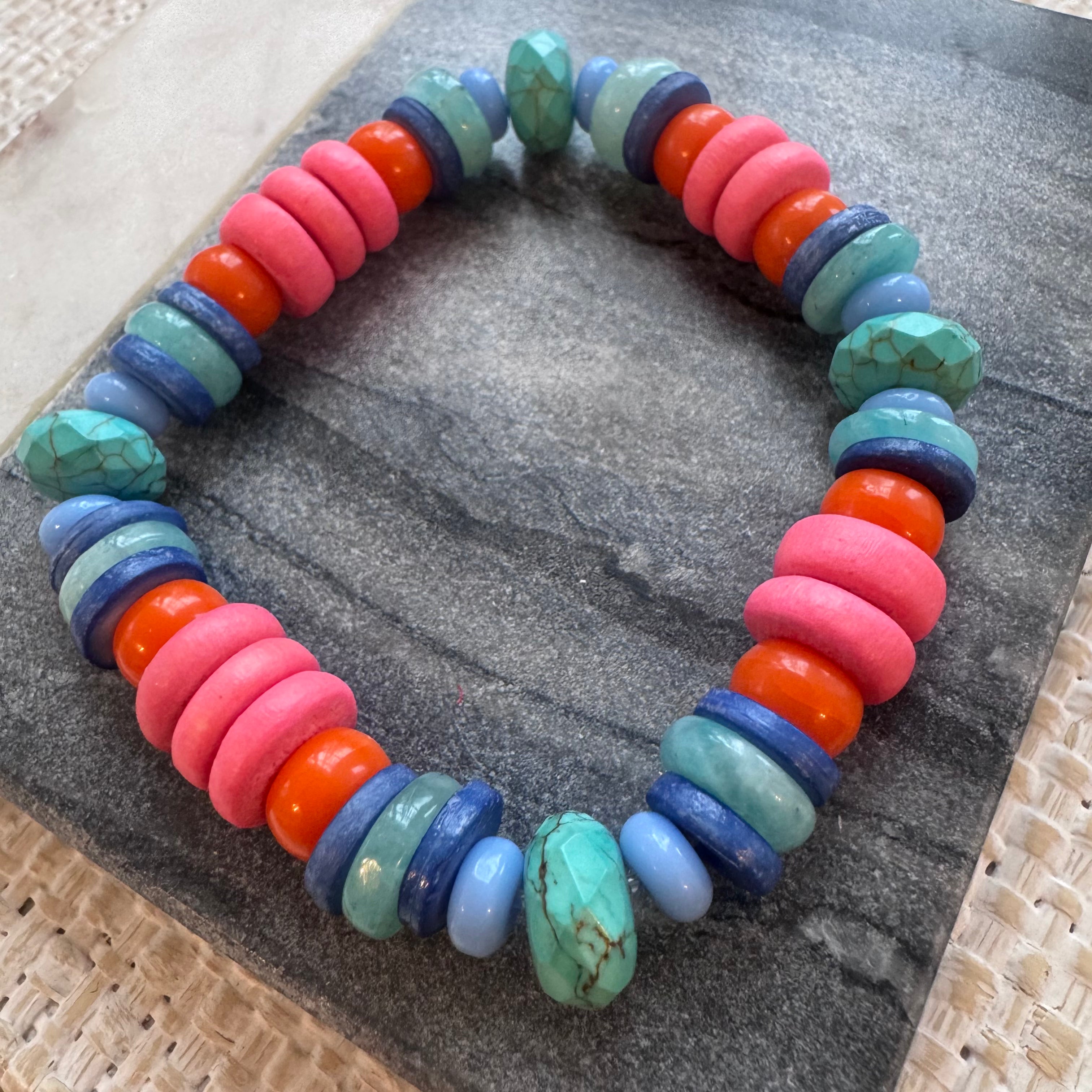 Vibrant coral and hot pink beads are layered with turquoise, soft blue, and deep navy accents for a color story that feels like summer nights and spontaneous plans. The faceted turquoise stones add just enough edge to keep it grown-up.