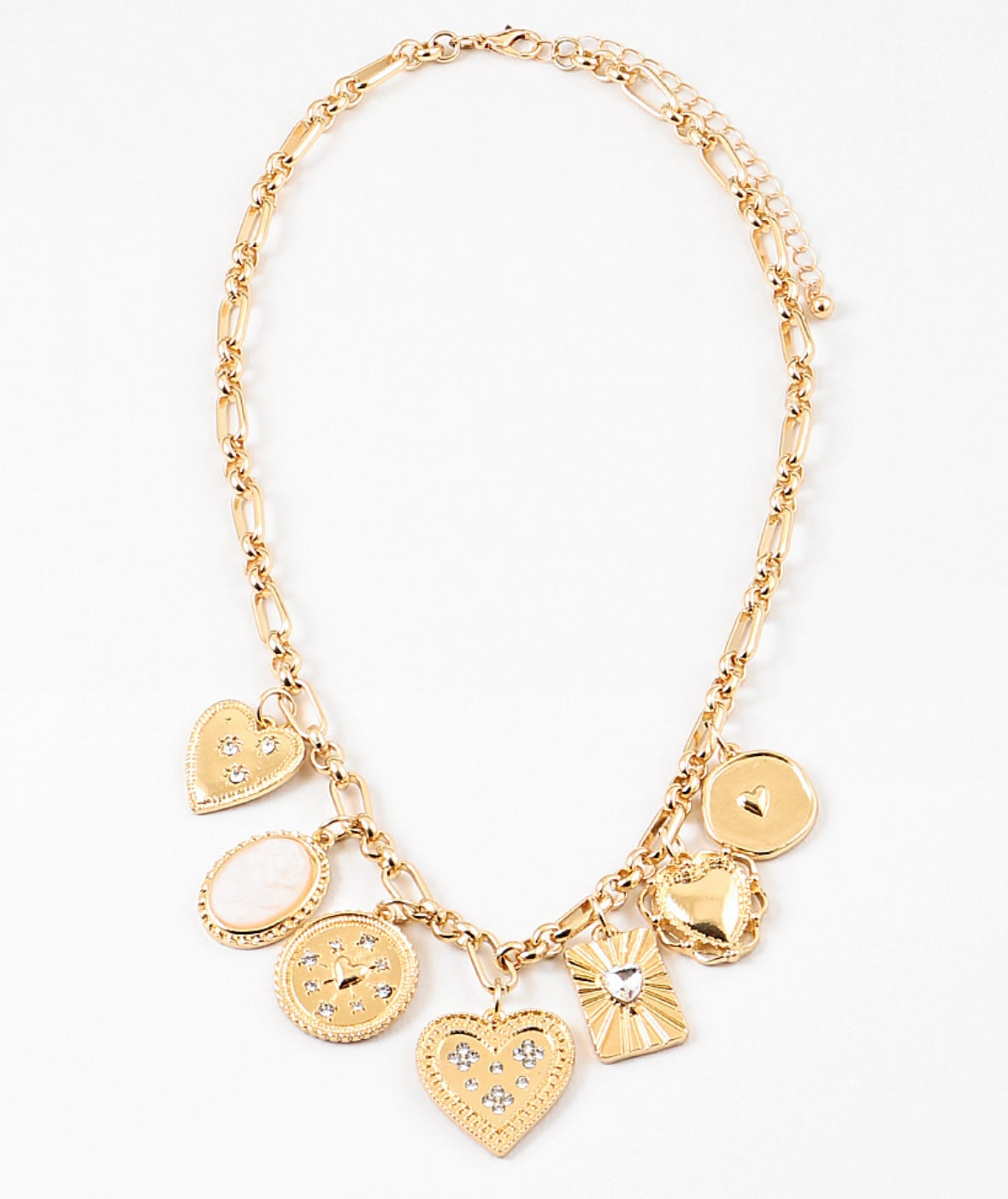 Meet The Love Story Charm Necklace — a mix of delicate hearts, a cameo, and sparkling charms that feel like treasures collected over time. Each piece tells its own story, all strung together on a bold, gold chain that’s both timeless and modern. It’s that special necklace you’ll reach for when you want to feel dressed up but still yourself.