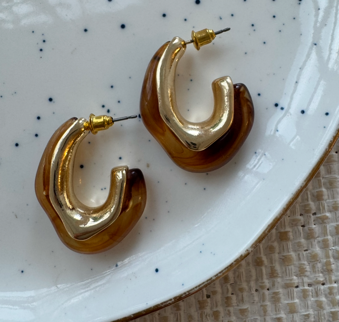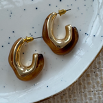 A blend of warm caramel resin and fluid gold curves gives these hoops their stunning, sculptural look. They’re lightweight, modern, and effortlessly cool — the kind of earrings that make even a simple tee look styled. Soft swirls of amber tones pair beautifully with the glossy gold finish, creating an artful hoop that feels both earthy and elevated.