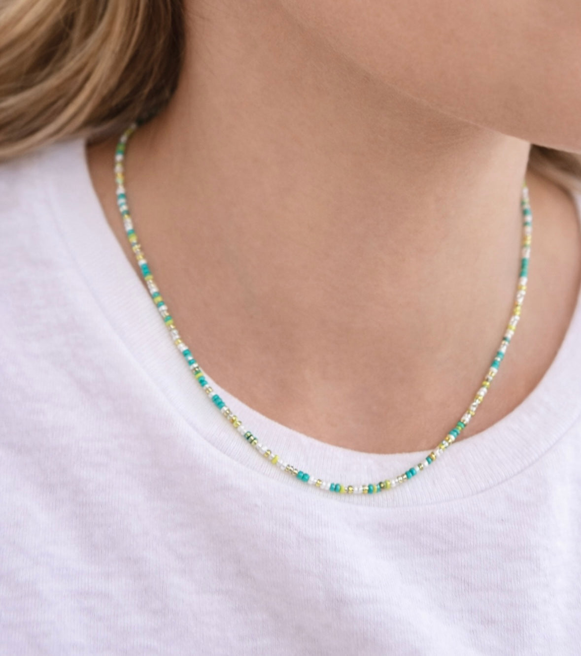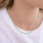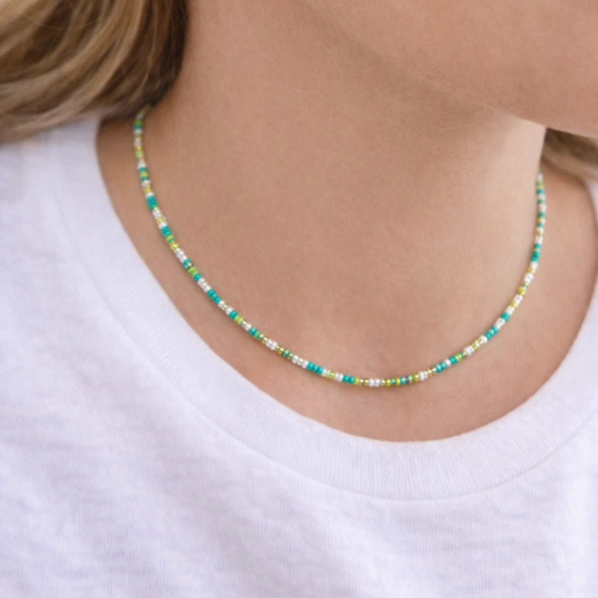 A delicate beaded necklace featuring a soft mix of turquoise, sea-green, pale yellow, and ivory tones. Designed to sit effortlessly at the collarbone, this lightweight strand adds an easy pop of color while remaining subtle enough for everyday wear. Finished with a silver clasp and adjustable extender, it’s perfect worn alone or layered with your favorite chains.