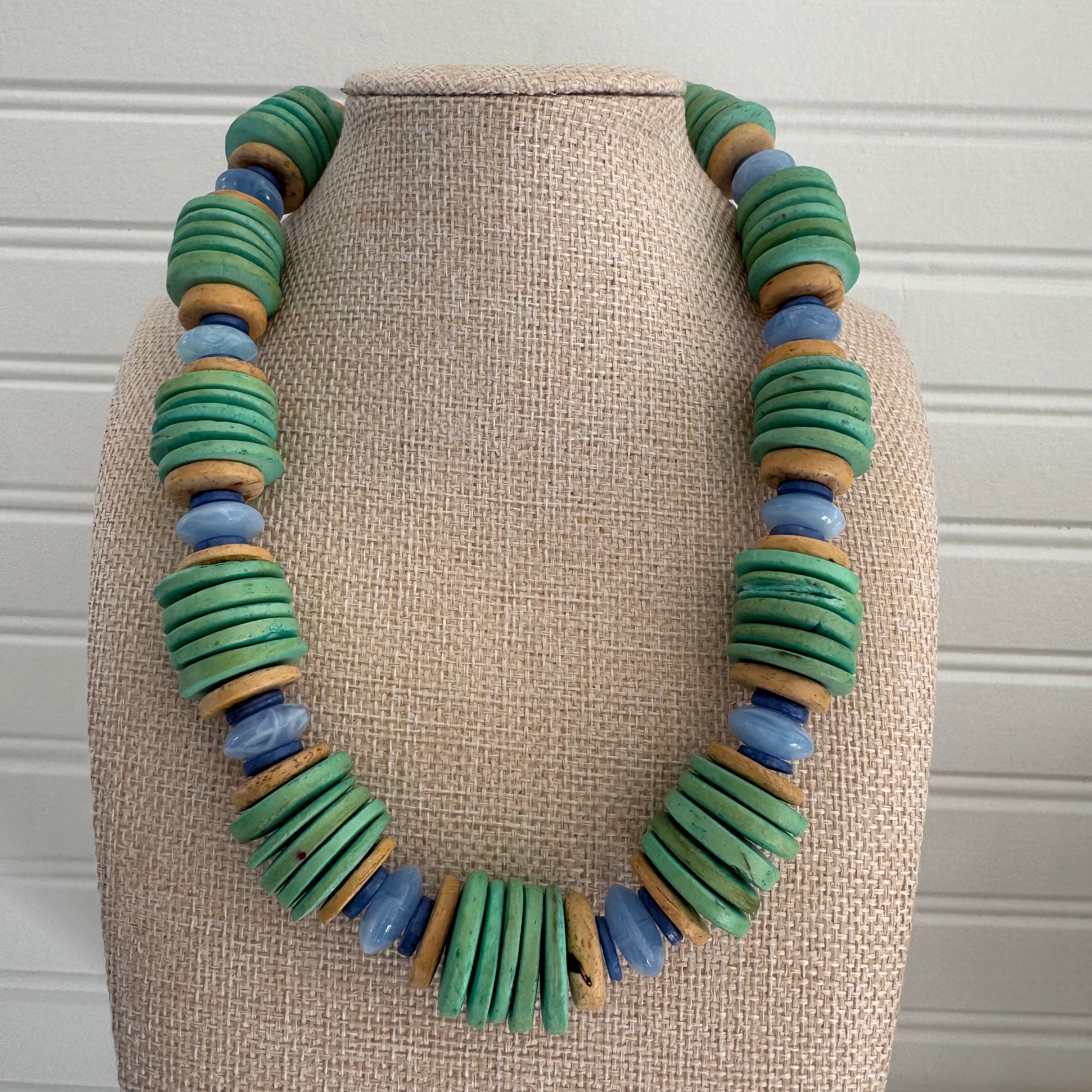 The Seafoam Stacks Necklace captures the feeling of waves rolling onto the shore — layered shades of sea green, sky blue, and sandy tan create a soothing mix that’s both artful and effortless. Each disc is stacked by hand, giving the piece texture and movement that feels perfectly relaxed and coastal.