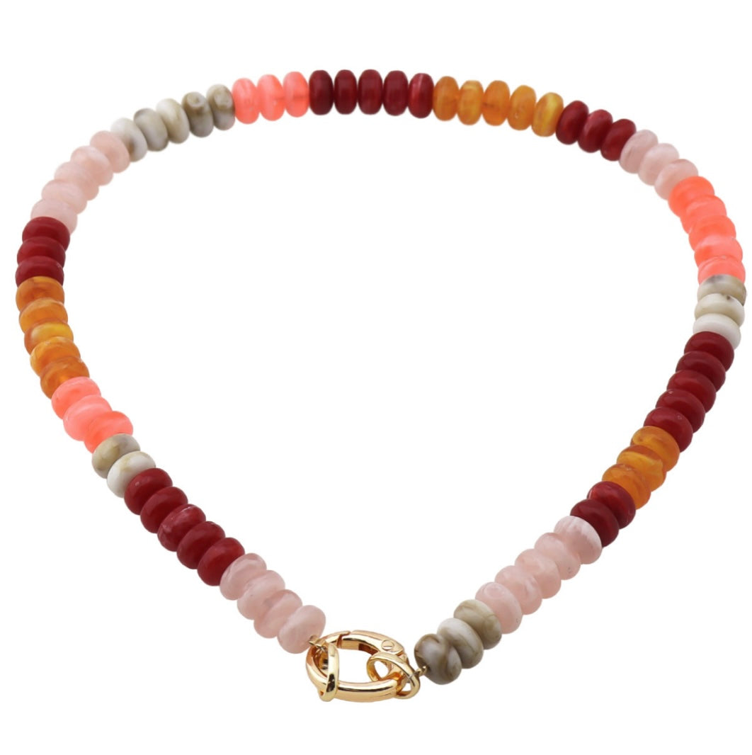 A soft blend of blush pinks, terracotta reds, and golden honey tones—this resin necklace feels like the warmth of late afternoons in Autumn. Each smooth bead catches the light just enough to give a subtle glow, and the gold clasp adds a polished finish. It’s easy to wear with everyday tees or layered with your favorite chains for a pop of color and texture. Lightweight, modern, and full of feel-good hues that go with everything.