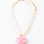 luminous strand of creamy lemon beads sets the stage for a bold, marbled blush heart pendant that instantly captures attention. The oversized silhouette feels modern and playful, while the soft pink tones keep it romantic and wearable. It’s the kind of piece that makes a simple outfit feel styled, polished, and full of personality.