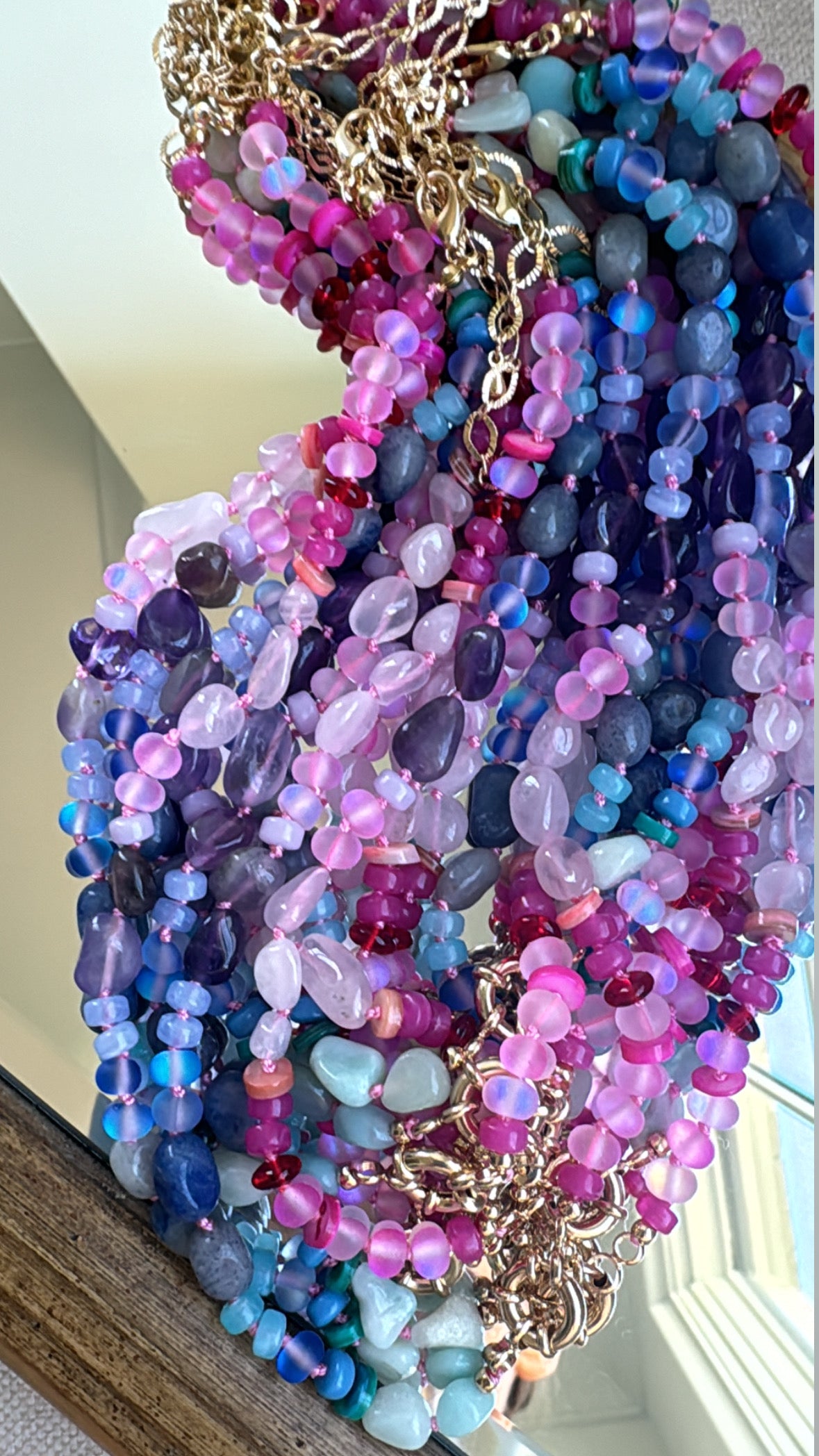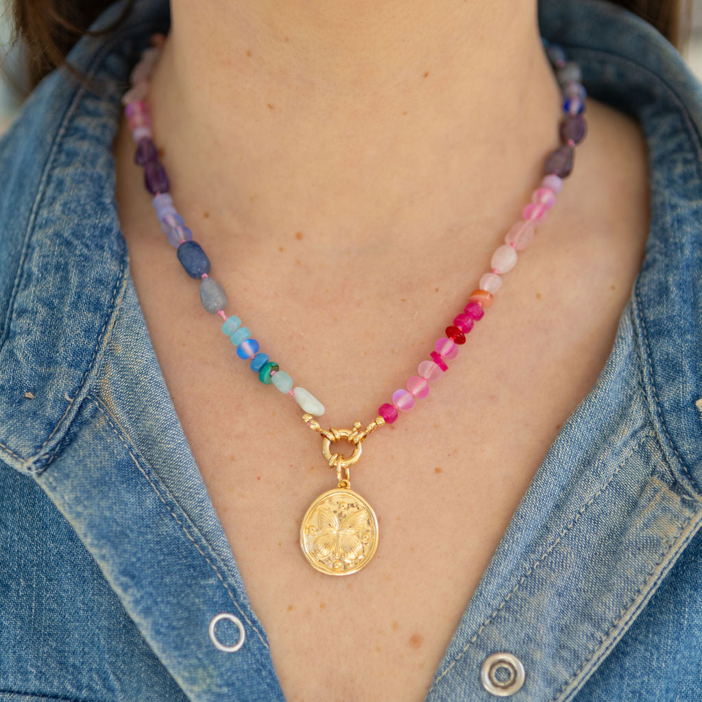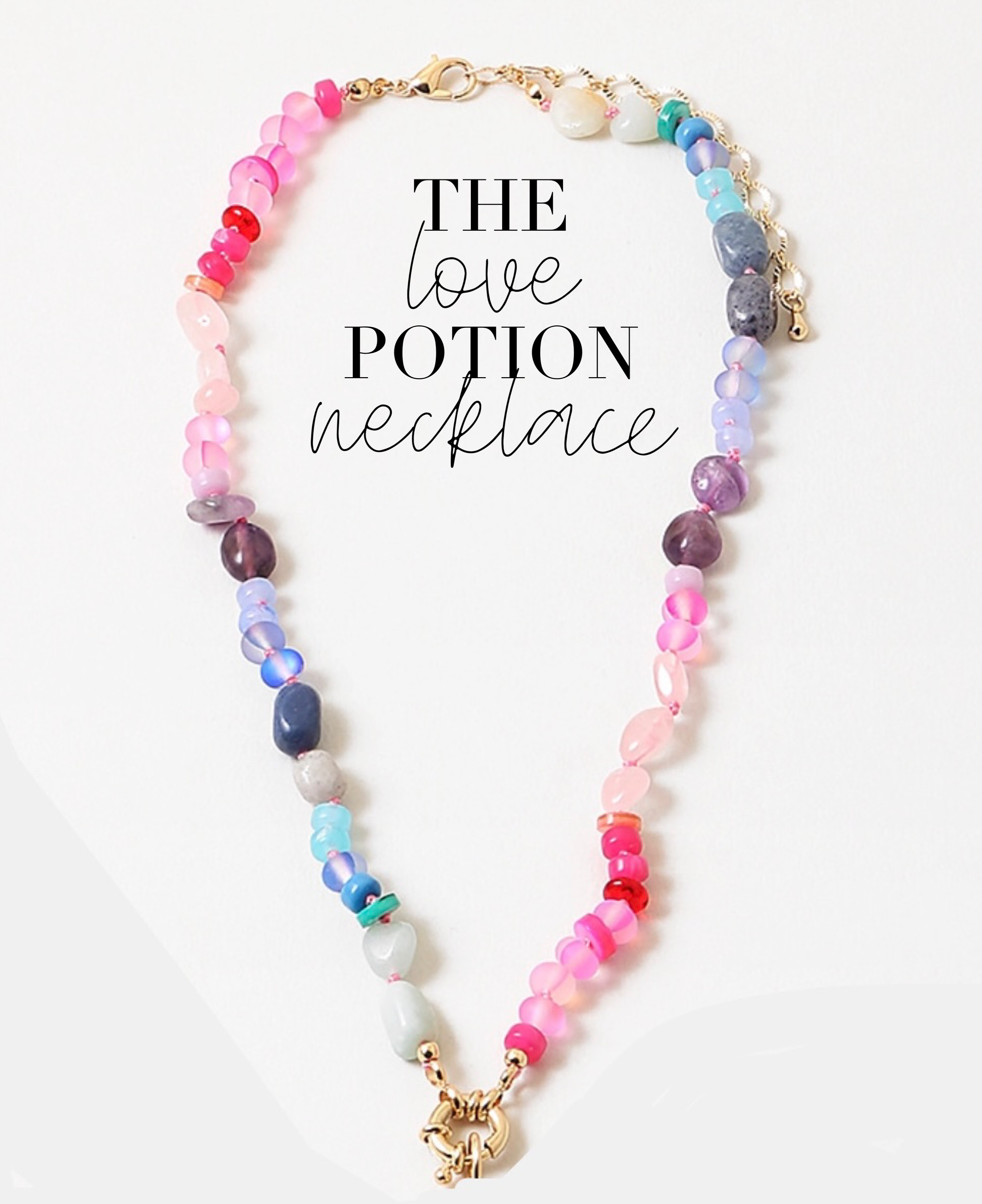 Made from resin and semi-precious stones, the colors in our Love Potion Necklace are incredible. Each stone is knotted individually with cord. The shapes and coloe palette and frosted stones remind us of recycled beach glass. We also love the gold toggle in the front allowing you to open it up and add a charm if you’d like.  It’s beautiful paired with any other pieces from our collection and looks like perfection on everyone! We know you are going to love it!!