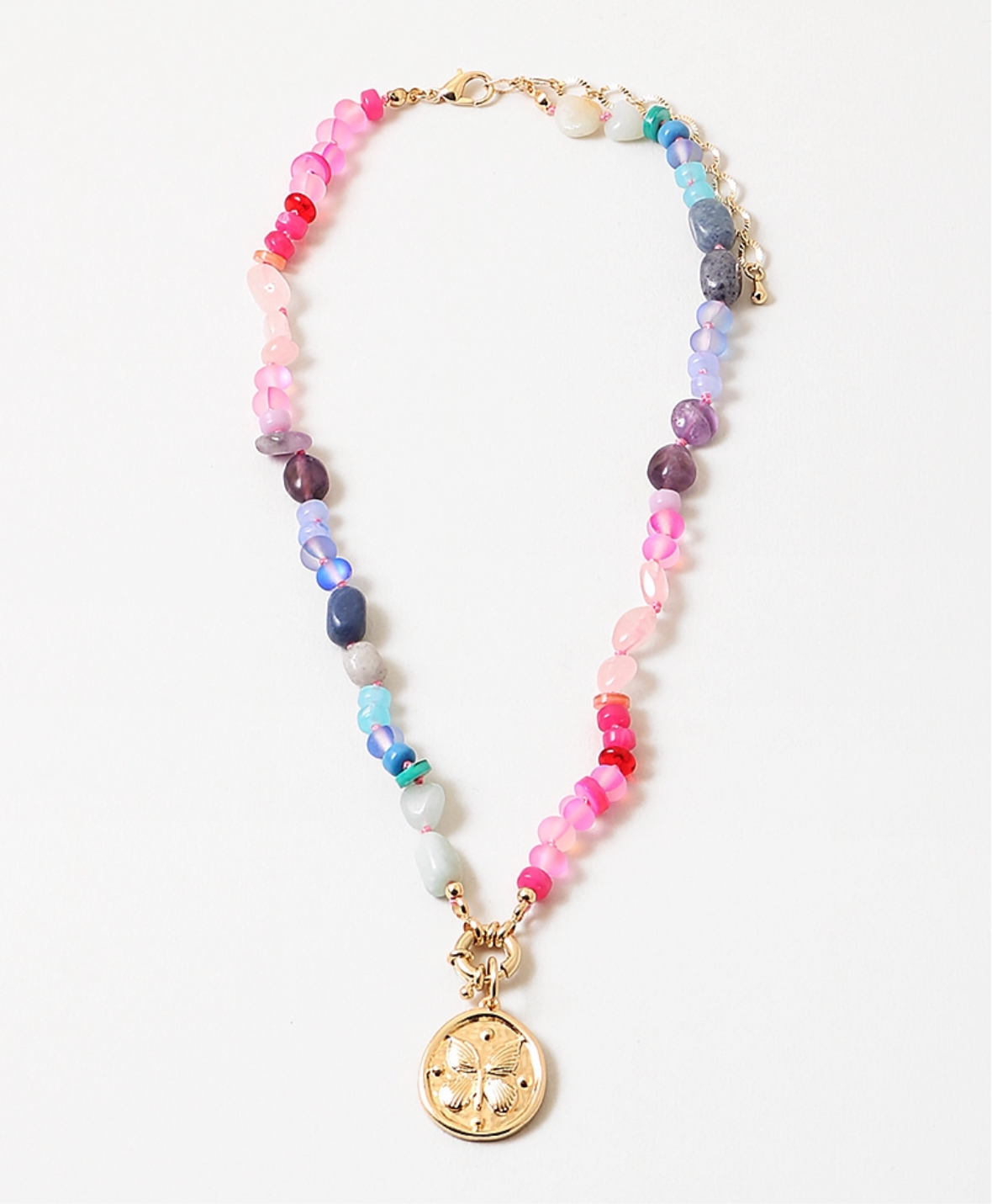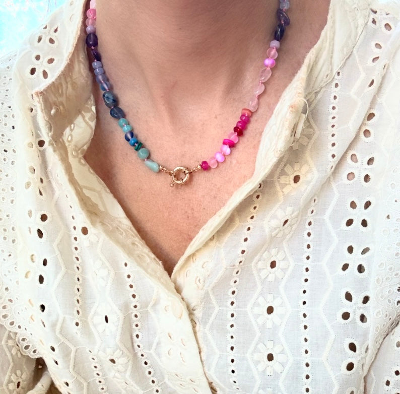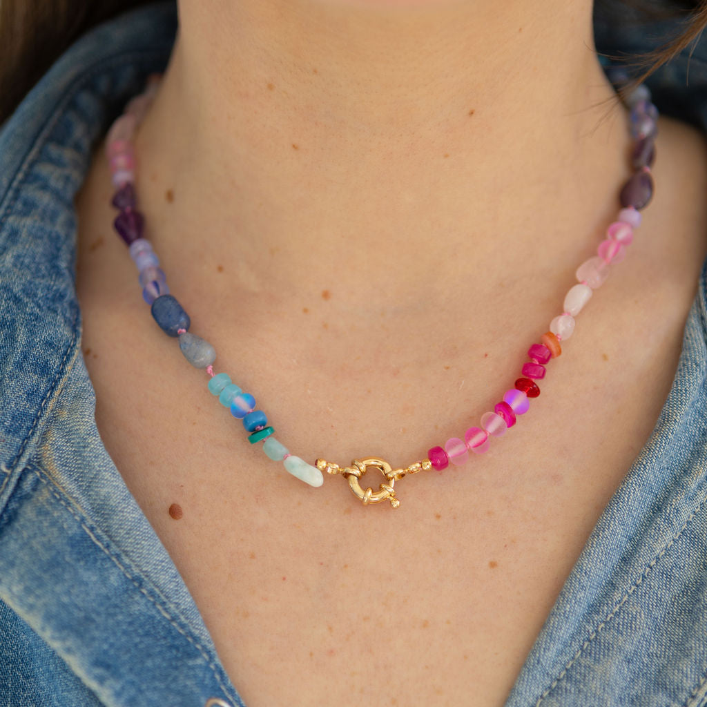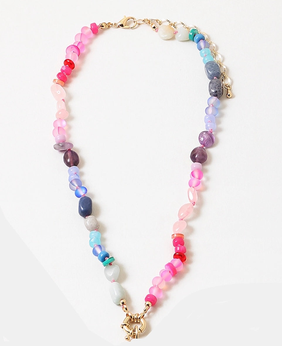 Made from resin and semi-precious stones, the colors in our Love Potion Necklace are incredible. Each stone is knotted individually with cord. The shapes and coloe palette and frosted stones remind us of recycled beach glass. We also love the gold toggle in the front allowing you to open it up and add a charm if you’d like.  It’s beautiful paired with any other pieces from our collection and looks like perfection on everyone! We know you are going to love it!!