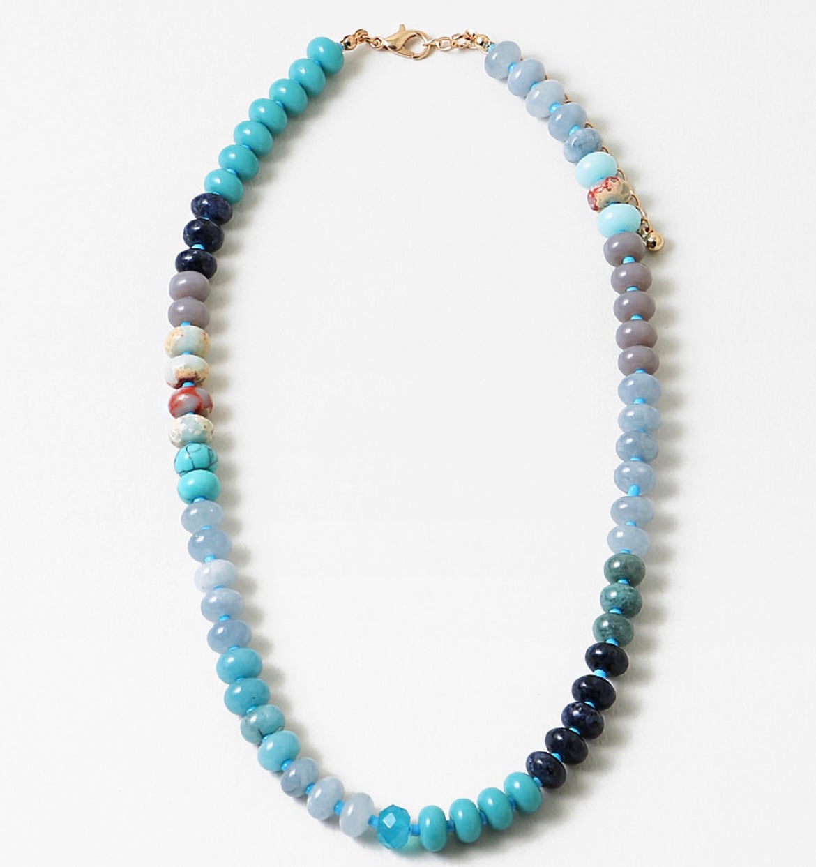 This stunning gemstone necklace features a harmonious blend of cool tones, perfect for the Woman who finds calmness around the water or at the beach. The necklace is composed of a variety of semi-precious stones that transition beautifully from deep navy to soft sky blue, with accents of earthy neutrals and vibrant turquoise. Each bead is carefully chosen to create a balanced and eye-catching design, making it a versatile accessory that can easily be dressed up or down!