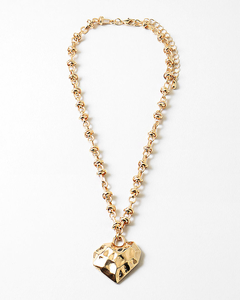 This statement necklace features a textured gold heart pendant suspended from a sculptural, high-shine chain. The faceted surface catches the light beautifully, giving it depth and dimension with every movement. It’s feminine without being delicate. Confident without trying too hard. The kind of piece that becomes part of your story.