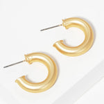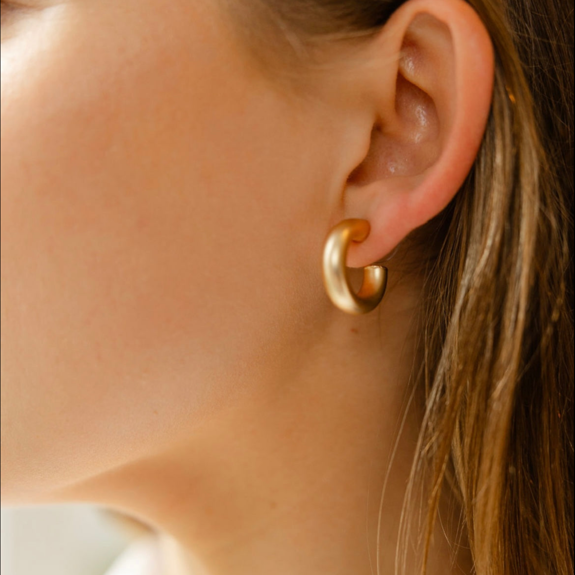 Simple, sculptural, and endlessly wearable, these matte gold hollow hoops are the definition of everyday chic. Their softly rounded silhouette and brushed matte finish give them a modern, understated glow that pairs beautifully with anything in your jewelry collection. At ½” in diameter, they’re lightweight, polished, and the perfect little hoop for effortless daily wear.